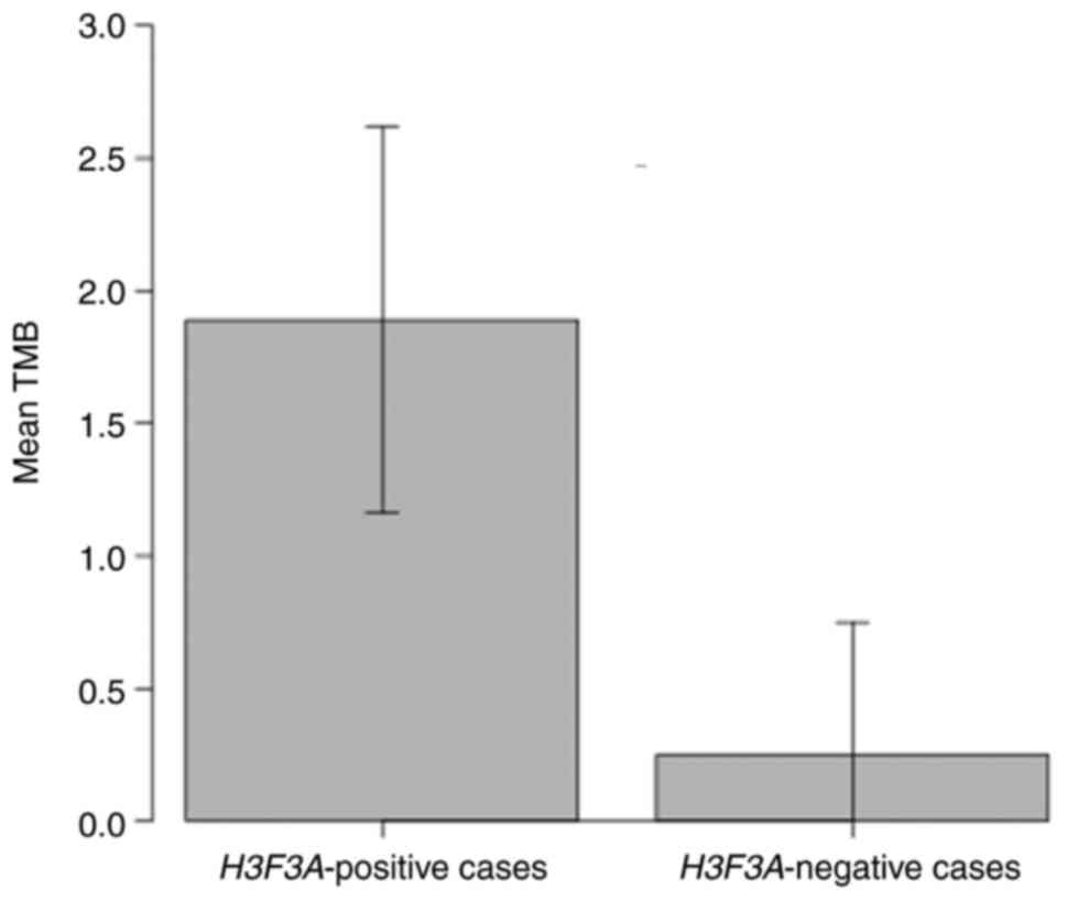 NRF1 intron 5 (chr7: 129699940) was fused with BRAF intron 8 (chr7: 140789425) (Fig. 2). The COL1A2-ALK rearrangement comprised intron 31 of COL1A2 (chr7: 94417378) and exon 18 of ALK (chr2: 29227044). The kinase domains of both predicted proteins were retained. The tumor mutation burden (TMB) was significantly lower in the samples without H3F3A mutation (case 5, 6, 7, 8) than in the samples with H3F3A mutation (case 1, 2, 3, 4) (Student's t-test, mean 0.25 vs. mean 1.89, P=0.01, Fig. 3). Of the 8 cases analyzed herein, the patients with kinase fusion had unique characteristics, such as a younger age (9 and 7 years) and a lower TMB (both, 0 muts/Mb) compared to the fusion-negative cases. No patients were enrolled in a trial or off-label use of an approved drug due to trial ineligibility, poor performance status, or unknown reasons.