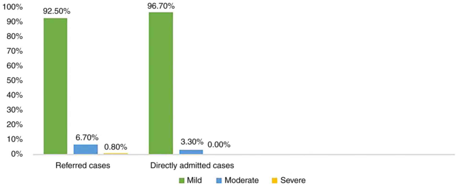 The demographic characteristics of the patients in the present study, consisting of 981 patients, are presented in Table I. Almost 60% of the patients were admitted directly via the emergency department of the hospital, while almost 40% of the patients were referred from another hospital. Furthermore, the mean age of the referred patients was ~58 months, while the patients who were directly admitted had a younger mean age of almost 50 months. The male patients constituted 63.6% of the study group, while the female patients constituted 36.4% of all the patients (Table I).