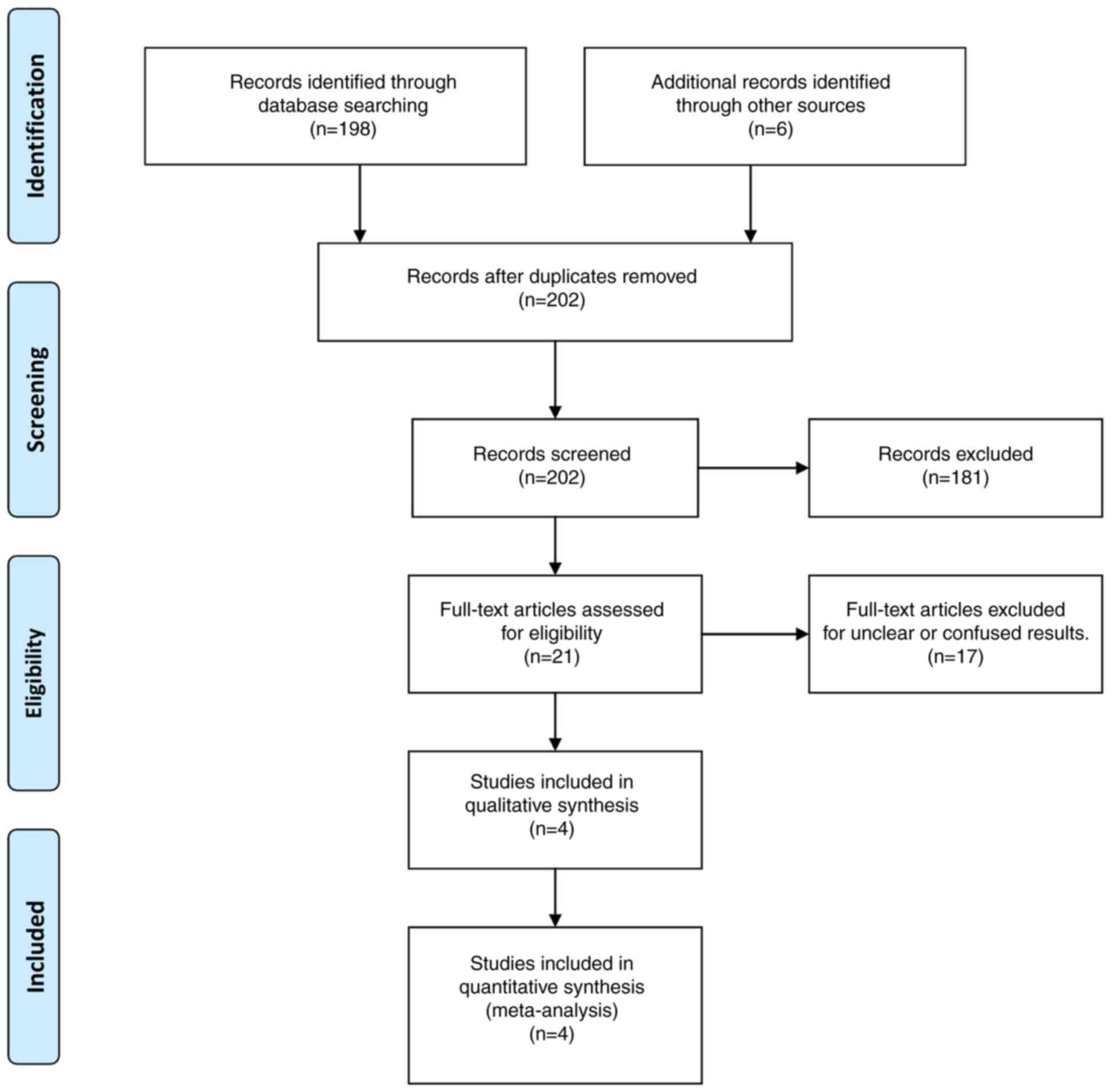 In total, four articles (15,16,18,19) fulfilled the eligibility criteria. The total number of patients was 2,308 [987 cases (poor outcomes) and 1,321 controls (good outcomes)]. The study sample was based on four studies (15,16,18,19) (Table II).