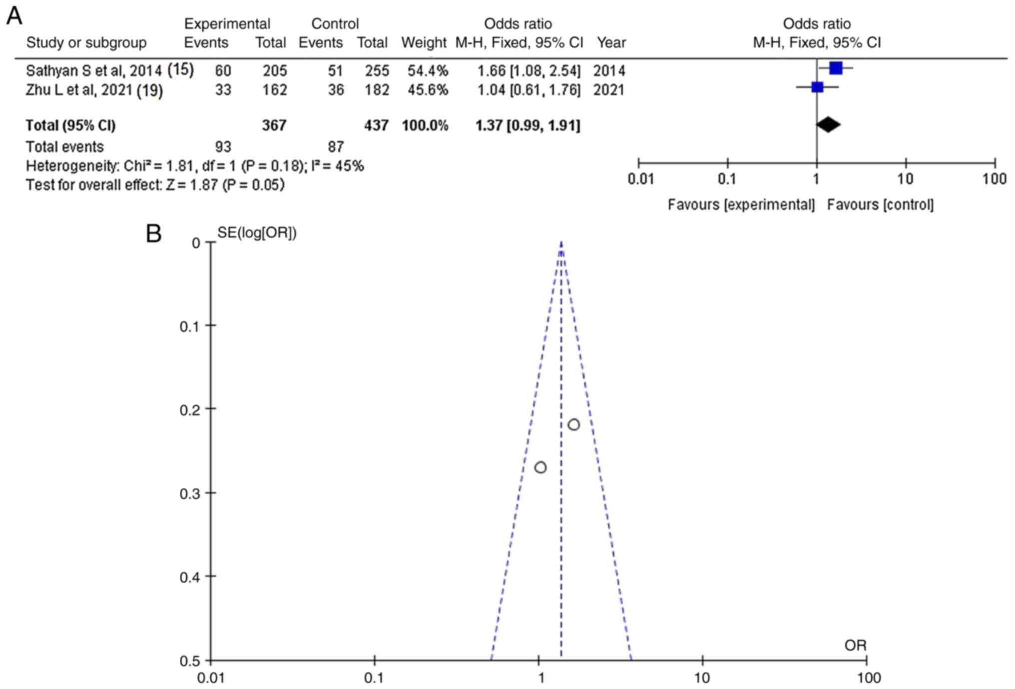 As regards SNP rs2287926, information was available in two articles (15,19) and demonstrated a statistically significant difference between the patients with IAs (cases with poor outcomes) and the controls (OR, 1.37; 95% CI, 0.99-1.91; P=0.0500) (Fig. 3A and Table III). SNP rs2287926 was found in 87 of 437 (19.9%) control patients and in 93 of 367 (25.3%) cases. When investigating the funnel plot, it was established that there was low heterogeneity (P=0.18 and I2=45%) and low publication bias (Fig. 3B).