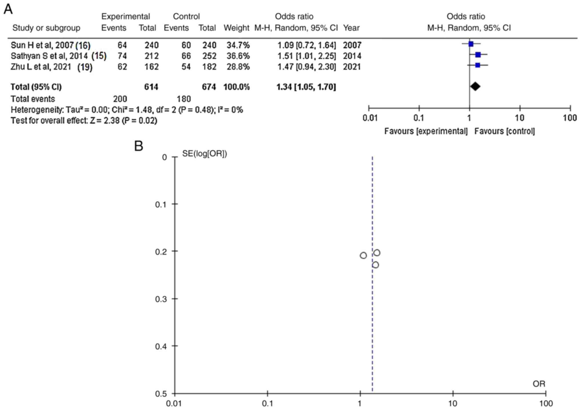 Information regarding the SNP rs251124 was available in three articles (15,16,19) and demonstrated a statistically significant difference between the patients with IAs (cases with poor outcomes) and the controls (OR, 1.34; 95% CI, 1.05-1.70; P=0.02) (Fig. 4A and Table III). SNP rs251124 was found in 180 of 674 (26.7%) control patients and in 200 of 614 (32.5%) cases. When investigating the funnel plot, it was established that there was no heterogeneity (P=0.48 and I2=0%) and no publication bias (Fig. 4B).