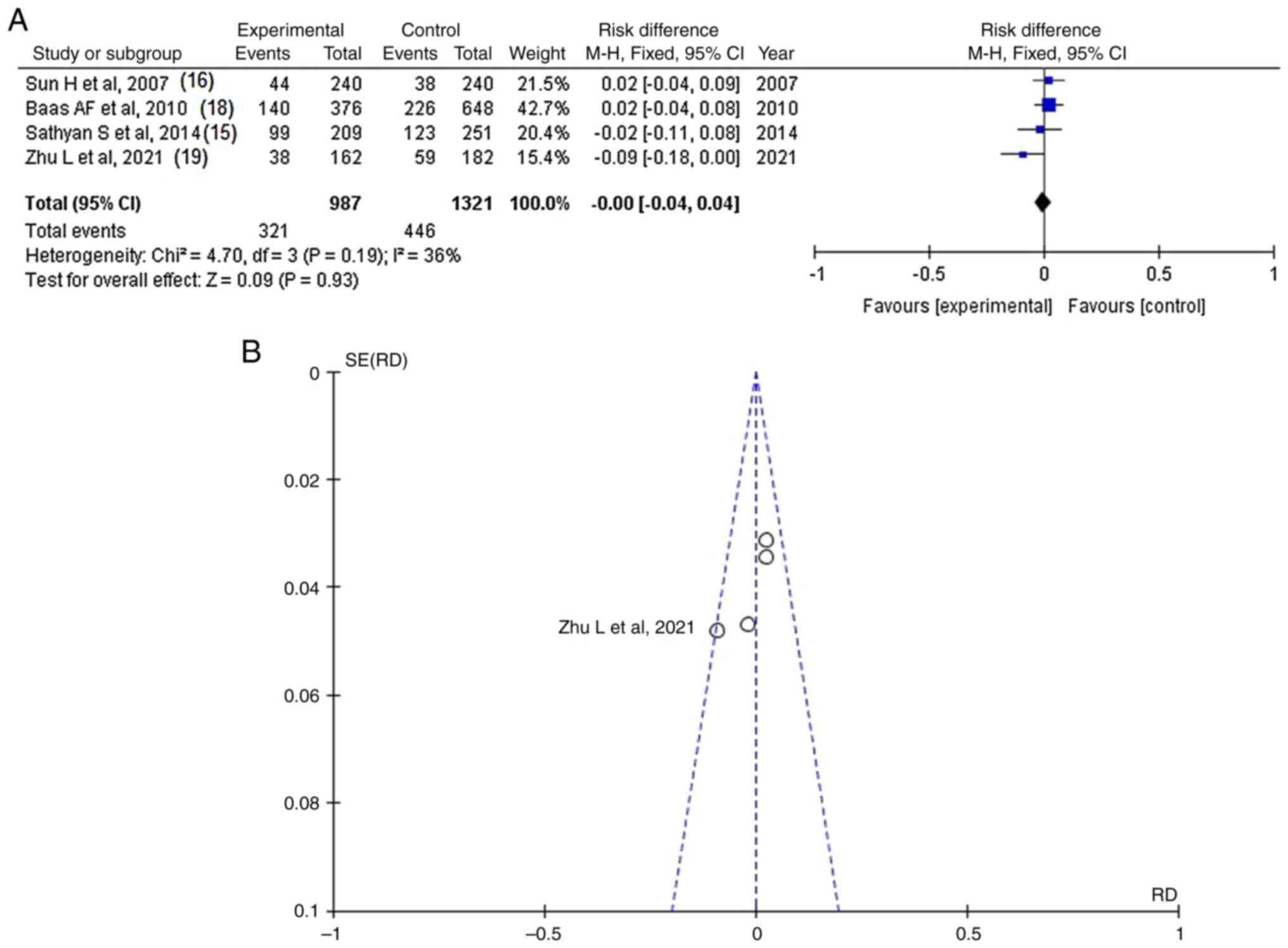 As regards SNP rs173686, information was available in four articles (15,16,18,19) and demonstrated no statistically significant difference between the patients with IAs (cases with poor outcomes) and the controls [OR, -0.00; 95% CI, (-0.04)-0.04; and P=0.93] (Fig. 5A and Table III). SNP rs173686 was found in 446 of 1,321 (33.7%) control patients and in 321 of 987 (32.5%) cases. When investigating the funnel plot, it was established that there was low heterogeneity (P=0.19 and I2=36%) and low publication bias (Fig. 5B).