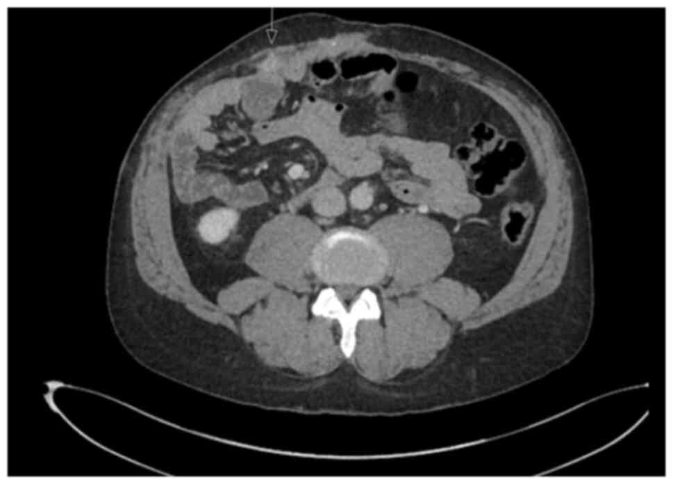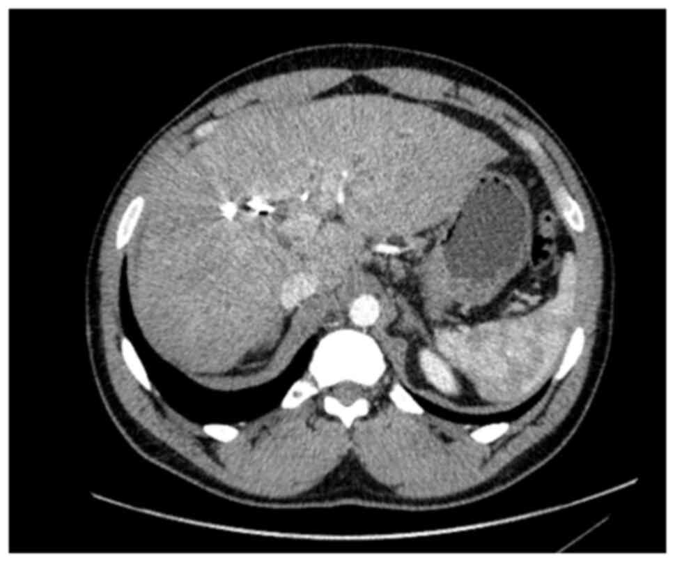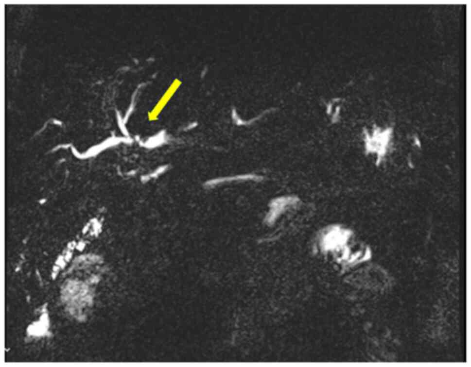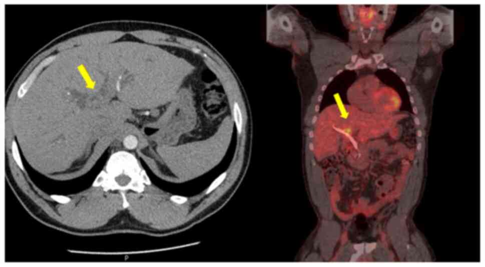 Despite these advances, the UK did not have an approved liver transplant programme for cholangiocarcinoma at the time of the treatment of the patient described in the present case report, limiting access to transplant-based pathways. Organ shortage further restricts curative options in this patient population, and upfront surgical resection remains the mainstay of treatment, albeit with key technical challenges. Regardless of treatment modality, recurrence rates remain high, affecting ~50% of cases (3,4).