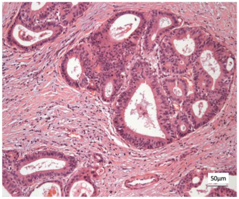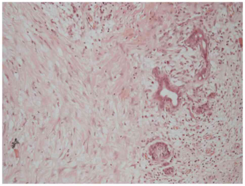A histological examination of the rectus sheath deposit confirmed metastatic moderately differentiated adenocarcinoma, morphologically consistent with the patient s original diagnosis of hilar cholangiocarcinoma (Fig. 10). Histology was performed by the Department of Histopathology at King s College Hospital using routine paraffin-embedded sections, formalin fixation and standard diagnostic laboratory protocols.