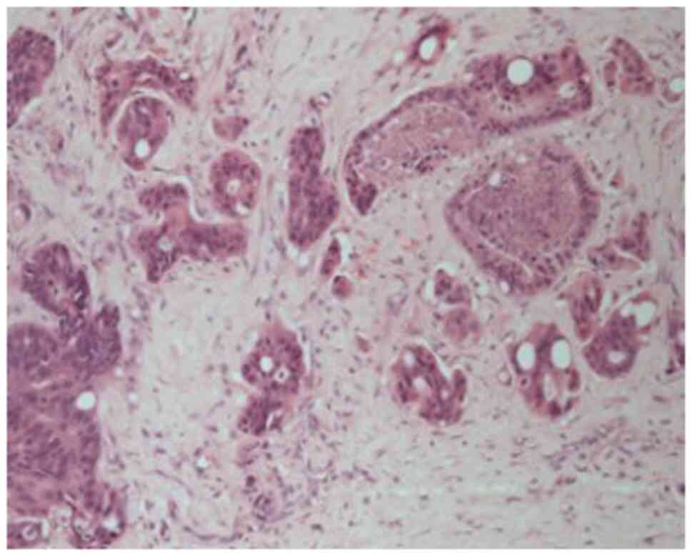 HER2 overexpression has been identified in ~10-15% of biliary tract cancers (BTCs), including extrahepatic cholangiocarcinoma. Several studies have explored the prognostic relevance of HER2 overexpression in BTC, though findings have varied. In 2020, Vivaldi et al (17) reported HER2 overexpression and associated it with a significantly shorter disease-free survival, suggesting a more aggressive biological behaviour. In 2021, the multicentre study by Hori et al (18) found no significant impact of HER2 expression on survival outcomes across intrahepatic and extrahepatic cholangiocarcinomas, thus challenging its utility as a prognostic marker. Recently, in 2024, Kim et al (19) demonstrated that HER2 amplification was significantly associated with a reduced overall survival, reinforcing its potential role as a negative prognostic factor in BTC and a rationale for HER2-targeted therapies.