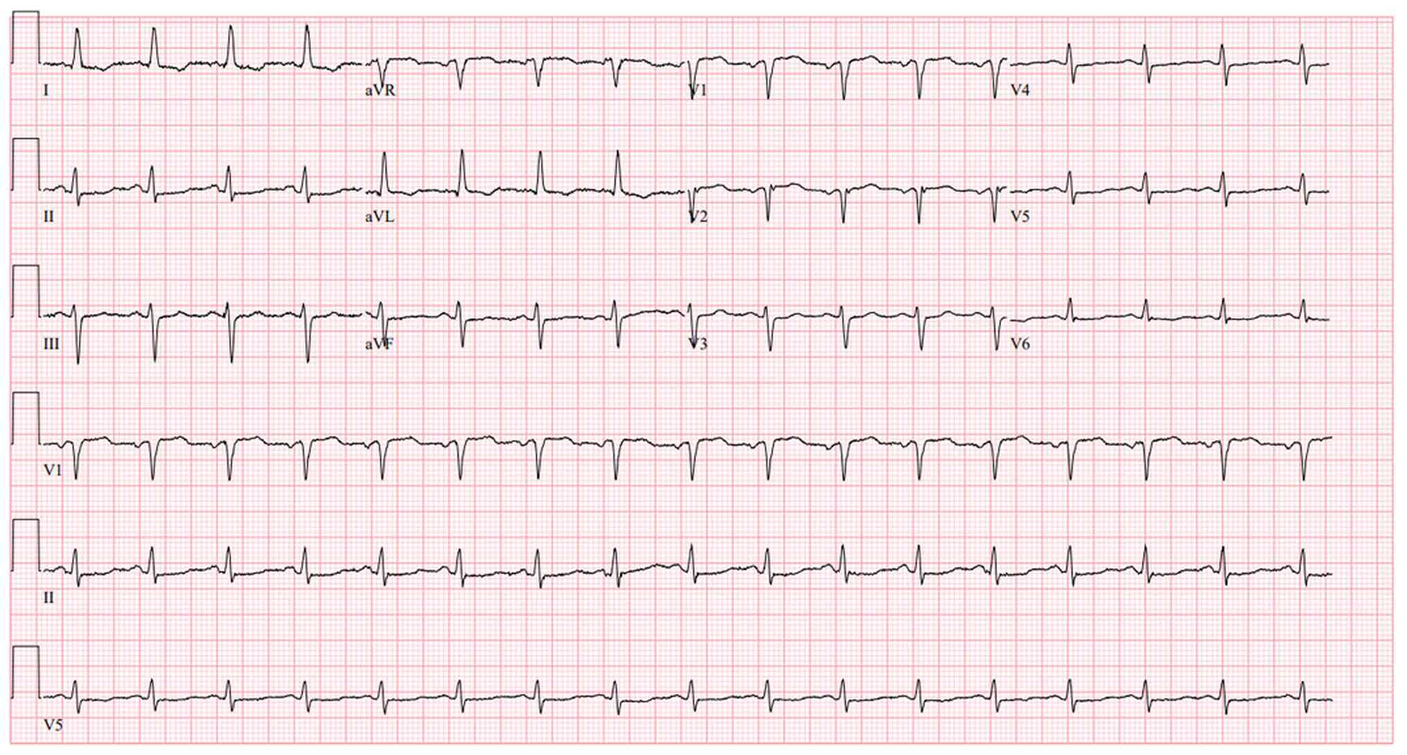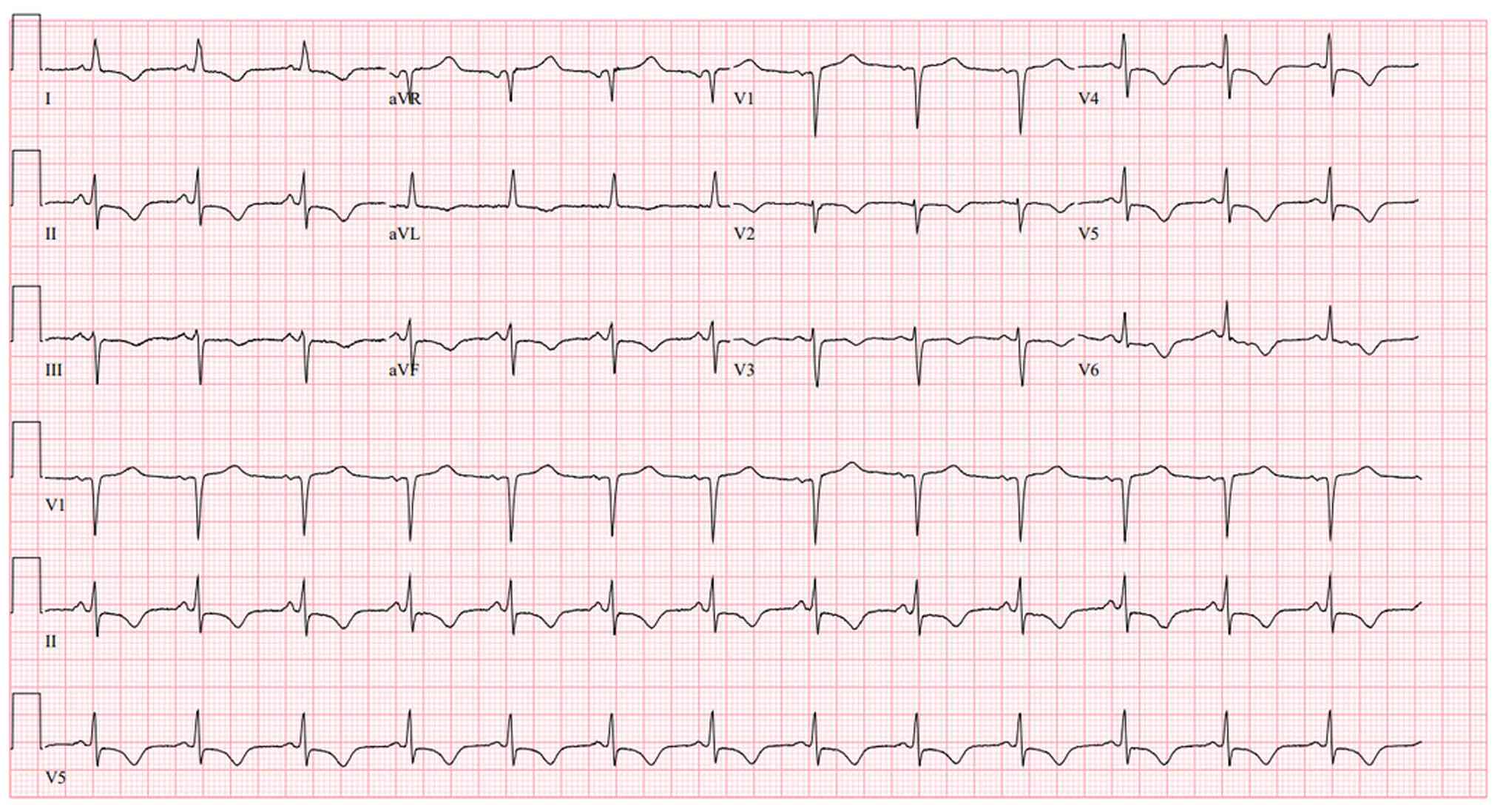 However, within 24 h, the patient returned with persistent nausea, vomiting and new dull periumbilical pain. A repeat ECG demonstrated diffuse ST-segment depressions with T-wave inversions in inferior (II, III and aVF), lateral (I, aVL and V5-V6) and anterior (V2-V4) leads, along with upright T waves in aVR and V1 (Fig. 3). High sensitivity troponin T was down-trending (~64 ng/l). Her thrombolysis in myocardial infarction (TIMI) score was 5, and the Global Registry of Acute Coronary Events (GRACE) score was 103. Transthoracic echocardiography revealed a severely reduced left ventricular ejection fraction (25-30%) and grade I diastolic dysfunction.