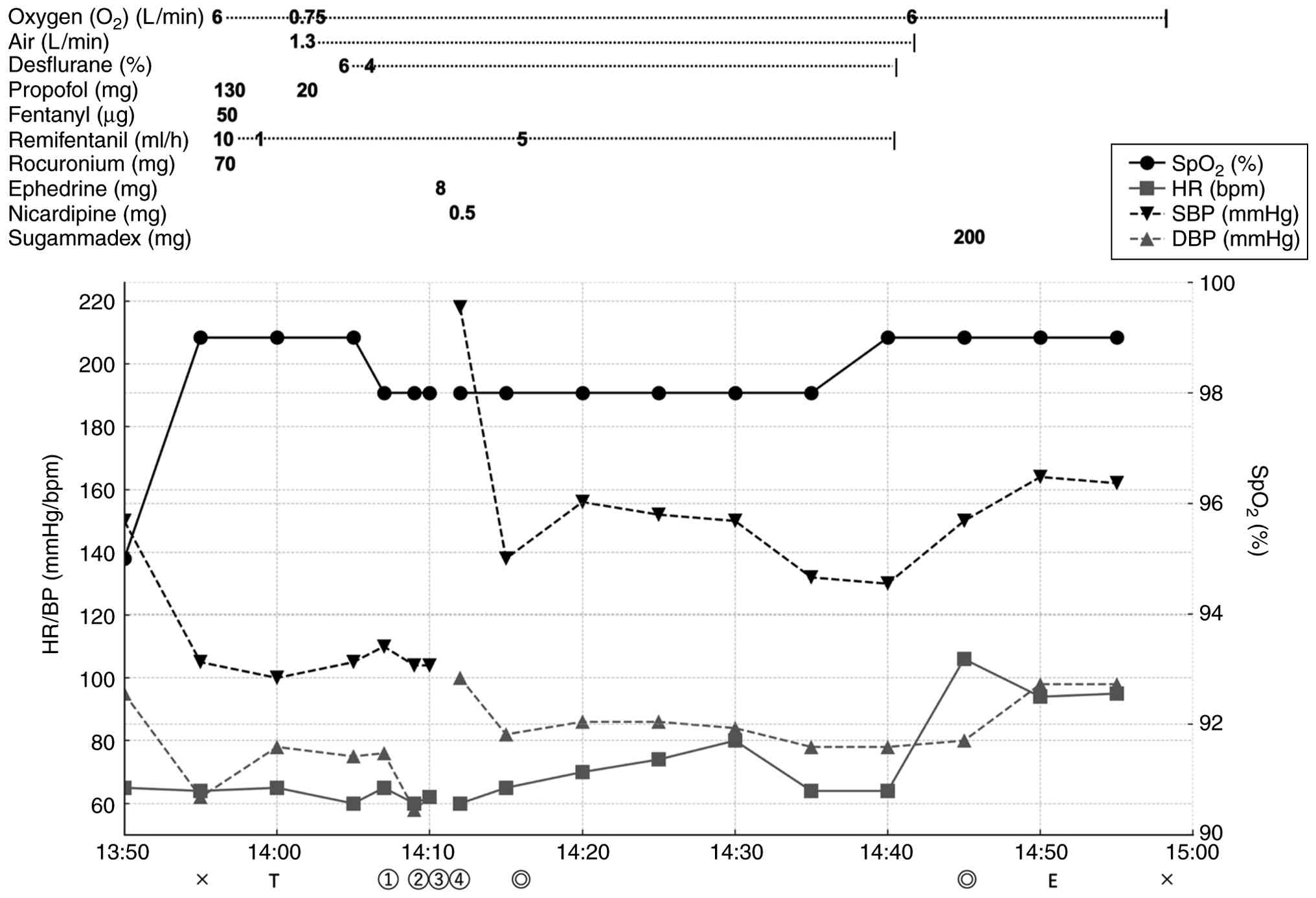 Anesthesia was induced with propofol 130 mg (1.67 mg/kg), fentanyl 50 µg (0.64 µg/kg), and rocuronium 70 mg (0.90 mg/kg), followed by successful left nasal intubation using a Ring-Adair-Elwyn (RAE) tube (7.0 mm, 27 cm). Anesthesia was maintained with desflurane and remifentanil infusion (Fig. 1).