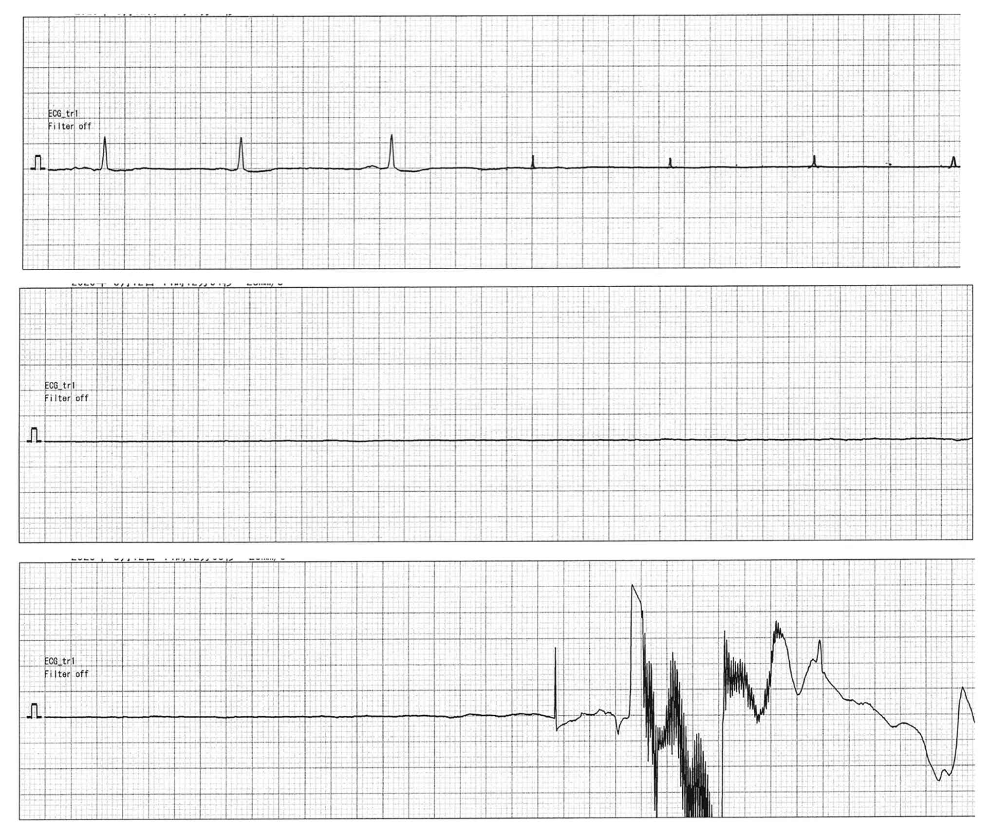 Immediately following throat pack insertion, the patient developed sudden cardiac arrest. Electrocardiographic monitoring revealed complete electrical asystole with absence of all cardiac electrical activity (Fig. 2). The asystolic period lasted ~20 sec, during which the pulse was impalpable.