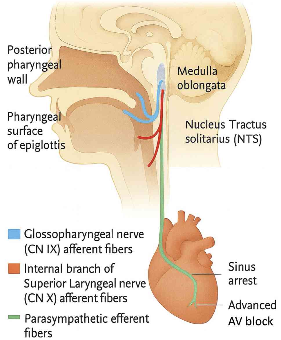 Sensory inputs from glossopharyngeal and vagal afferents converge on the nucleus tractus solitarius (NTS) of the medulla, where baroreceptor signals from the carotid sinus, aortic arch, and cardiopulmonary receptors are integrated (6). Parasympathetic efferents arising from the dorsal motor nucleus of the vagus nerve and nucleus ambiguus then project to the sinoatrial and atrioventricular nodes, exerting inhibitory effects on cardiac conduction. Experimental research has further demonstrated that the disruption of NTS neuronal activity directly induces bradycardia and hypotension (7), underscoring the central role of this reflex arc in cardiovascular regulation.