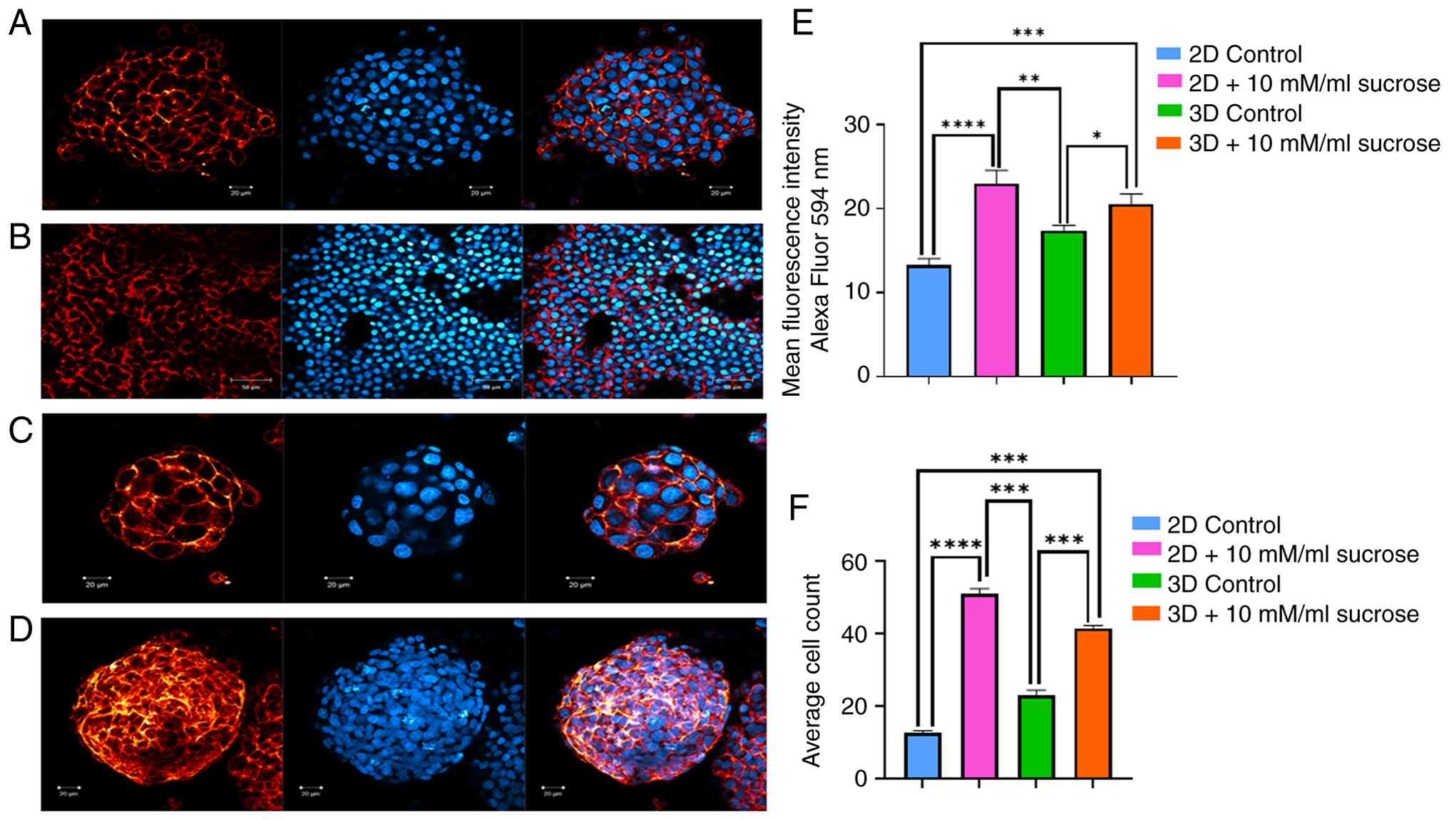 For each group, changes in cell proliferation in response to sucrose treatment were investigated by counting the nuclei of cells stained with DAPI using ImageJ software. Representative confocal images of DAPI-stained cells from 2D cultures are presented in Fig. 3A and B, while images from 3D cultures are presented in Fig. 3C and D. In these images, cell nuclei appear as blue fluorescent structures located in the central regions of the images due to DAPI staining. An increase in cell proliferation was observed under sucrose treatment. The quantitative analysis of nuclei counts is presented in Fig. 3F. Overall, an increase in proliferation was detected under the influence of sucrose.