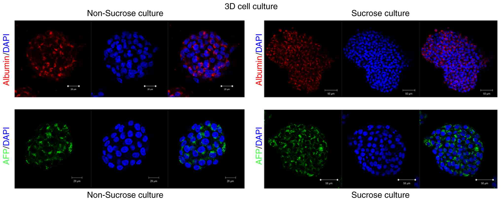 Therefore, the present study investigated the effects of sucrose on spheroid formation, AFP levels and albumin secretion, as well as on the morphology of living cancer cells. The term ‘living cancer cells’ refers to the HepG2 cell line (ATCC HB-8065), not primary tumor-derived cells.