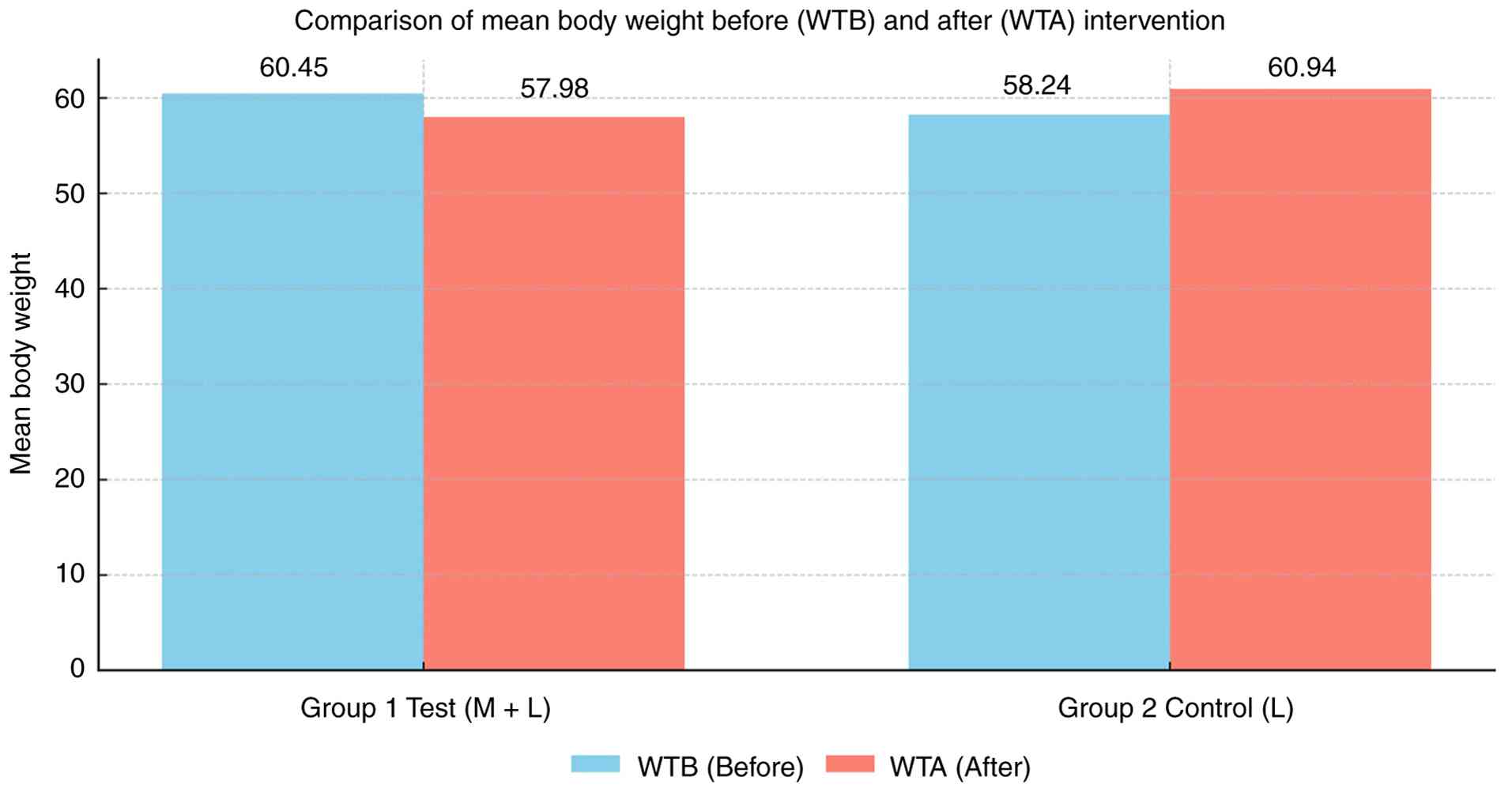Within-group comparisons revealed that in group 1 (metformin plus lifestyle modifications), the mean body weight decreased from 60.45 kg at baseline to 57.98 kg following the intervention, indicating a net weight reduction. By contrast, group 2 (lifestyle modifications alone) demonstrated an increase in mean body weight from 58.24 to 60.94 kg over the study period. These findings indicate a beneficial effect of adjunctive metformin therapy in preventing antipsychotic-associated weight gain (Table III and Fig. 2).