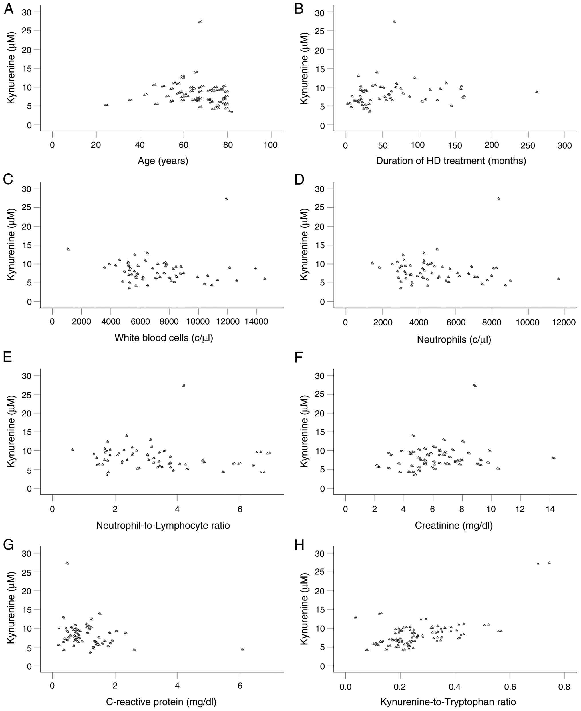 Among the factors analyzed in the present study and shown in Table I, serum kynurenine levels correlated with age (Rho=-0.245, P=0.007), the duration of HD (Rho=0.330, P<0.001), white blood cell count (Rho=-0.255, P=0.005), neutrophil count (Rho=-0.228, P=0.013), neutrophil-to-lymphocyte ratio (Rho=-0.265, P=0.004), creatinine (Rho=0.183, P=0.046) and CRP (Rho=-0.268, P=0.003). Notably, kynurenine did not correlate with tryptophan (Rho=0.143, P=0.126), whereas a positive correlation was observed with KRT (Rho=0.486, P<0.001) (Table IV). Scatterplots illustrating kynurenine and its statistically significant correlated factors are presented in Fig. 1.