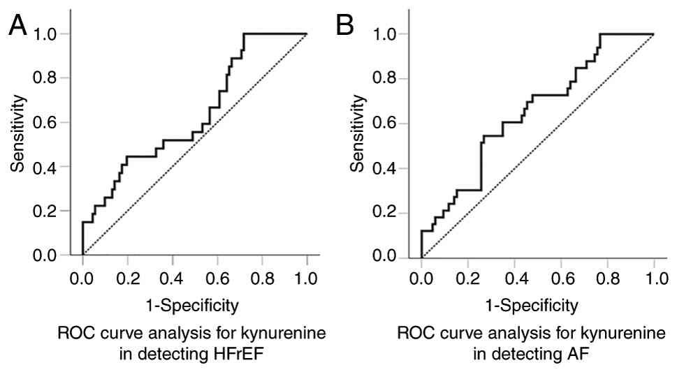 The present study then examined whether kynurenine levels vary between patients with and without AF undergoing HD. In patients undergoing HD, the prevalence of AF is higher than that in the general population and is linked to increased mortality (41). Even following effective treatment of AF with pulmonary vein isolation (42,43), the recurrence rate is significantly higher in patients undergoing HD, indicating the vulnerability of this population to AF (44,45). The present study found that serum kynurenine levels were higher in patients with AF. ROC curve analysis revealed the modest performance of kynurenine as a biomarker for AF in patients undergoing HD, with an AUC of 0.652 (P=0.005). However, for a multifactorial condition such as AF, a single factor is unlikely to achieve good discrimination. Thus, binary logistic regression analysis was used to evaluate whether kynurenine is an independent risk factor and possibly a pathogenetic factor for AF in this population. After adjusting for other factors associated with AF, kynurenine remained an independent predictor. For each 1 µM increase in serum kynurenine, the odds of AF increased by 37%. Whether this is caused by cardiac fibrosis or a direct arrhythmogenic effect of kynurenine pathway products remains to be clarified. Experimentally, kynurenine exerts pro-arrhythmogenic effects by modulating cardiac repolarization, possibly by reducing Kv11.1 channel levels (46). In other cell types, an increased expression of IDO-1 has been shown to upregulate P2X7 purinoceptor expression (47). Experimentally, P2X7 predisposes to AF by altering ion channel protein expression and inducing myocardial hypertrophy and fibrosis (48,49).
