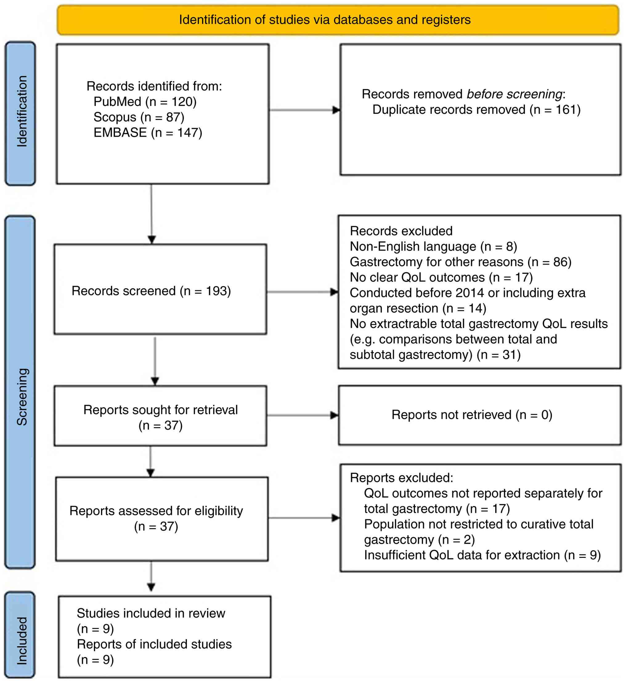 Studies were eligible if they investigated total gastrectomy, reported QoL outcomes using validated questionnaires and explicitly referred to curative total gastrectomy without any additional major organ resection. Non-English-language studies, those conducted for non-oncological indications, those lacking explicit QoL outcomes, or those not exclusively focused on total gastrectomy were excluded. The search was limited to studies published from 2020 onwards to reflect contemporary clinical practice following the widespread adoption of recent guideline updates. Studies involving multivisceral resections or comparing total to subtotal gastrectomy without extractable data specific to total gastrectomy were also excluded.