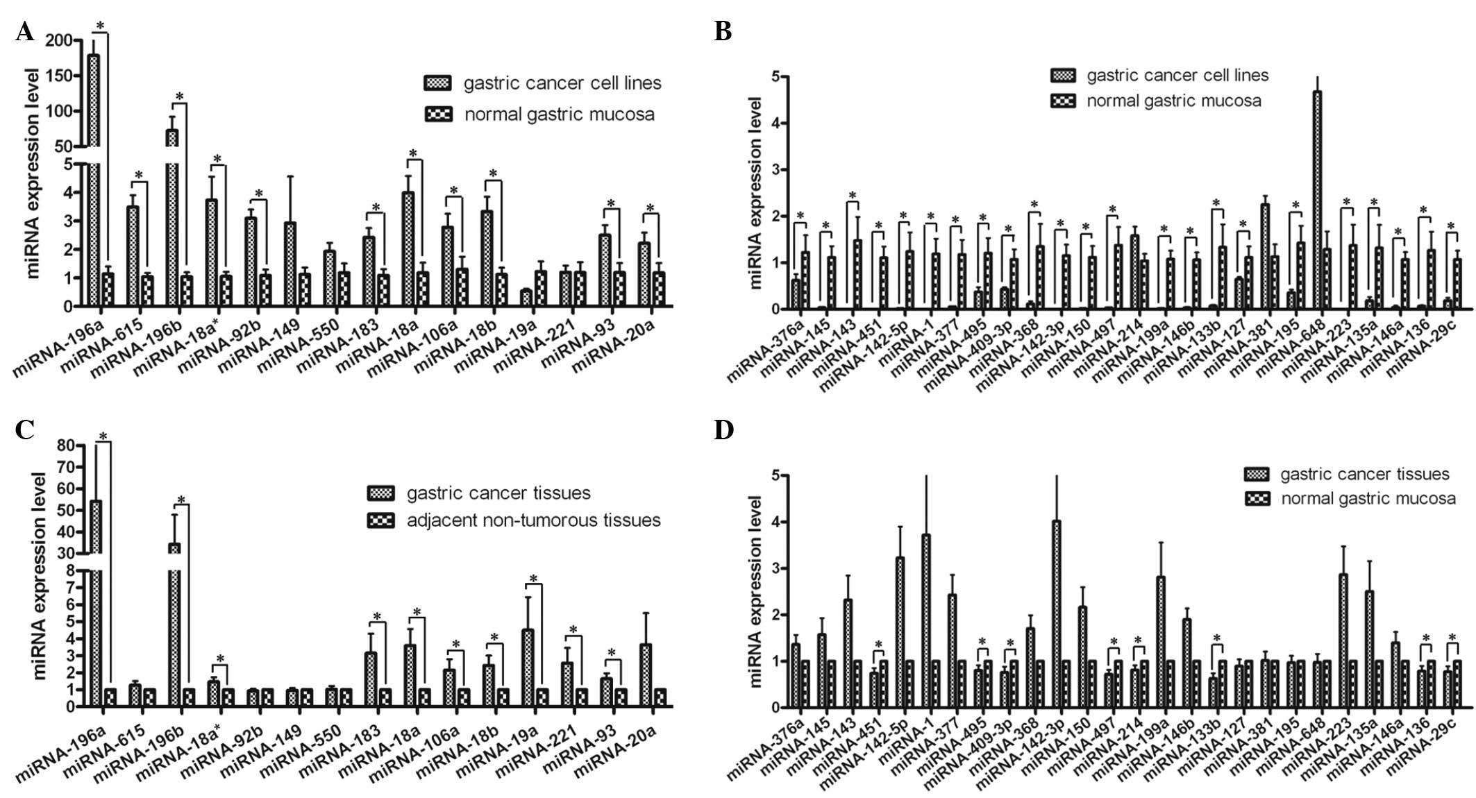 To validate the microarray findings, Q-PCR was undertaken for the 9 gastric cancer cell lines, 6 normal gastric mucosa, and a further 40 gastric cancer tissues and matched adjacent non-tumorous tissues for 41 candidate miRNAs. Four miRNAs had no commercial miRNA-specific primer: hsa-miR-17-5p, hsa-miR-301, hsa-miR-199a* and hsa-miR-572. hsa-miR-126 is being studied by another research team at our facility. Q-PCR-measured expression of the majority of selected miRNAs in gastric cancer cell lines and normal gastric mucosa was consistent with microarray results. The incidence of upregulated miRNAs and downregulated miRNAs across the cancerous and normal samples was 73.33% (11/15) and 88.46% (23/26), respectively (Fig. 2A and B). Moreover, as expected, certain discrepancies were detected when miRNA microarray data were validated with Q-PCR-measured expression levels. Nevertheless, the expression level of 41 miRNAs using Q-PCR showed a great deal of diversity when compared to microarray data. The incidence of upregulated miRNAs was 66.67% (10/15) and the incidence of downregulated miRNAs was 30.77% (8/26) (Fig. 2C and D). This was likely to be due to the high heterogeneity of cancer tissues relative to cancer cell lines. According to the results of miRNA microarray and Q-PCR, 8 upregulated miRNAs (hsa-miR-196a, hsa-miR-196b, hsa-miR-18a*, hsa-miR-183, hsa-miR-18a, hsa-miR-106a, hsa-miR-18b and hsa-miR-93) and 7 downregulated miRNAs (hsa-miR-451, hsa-miR-495, hsa-miR-409-3p, hsa-miR-497, hsa-miR-133b, hsa-miR-136 and hsa-miR-29c) were identified.