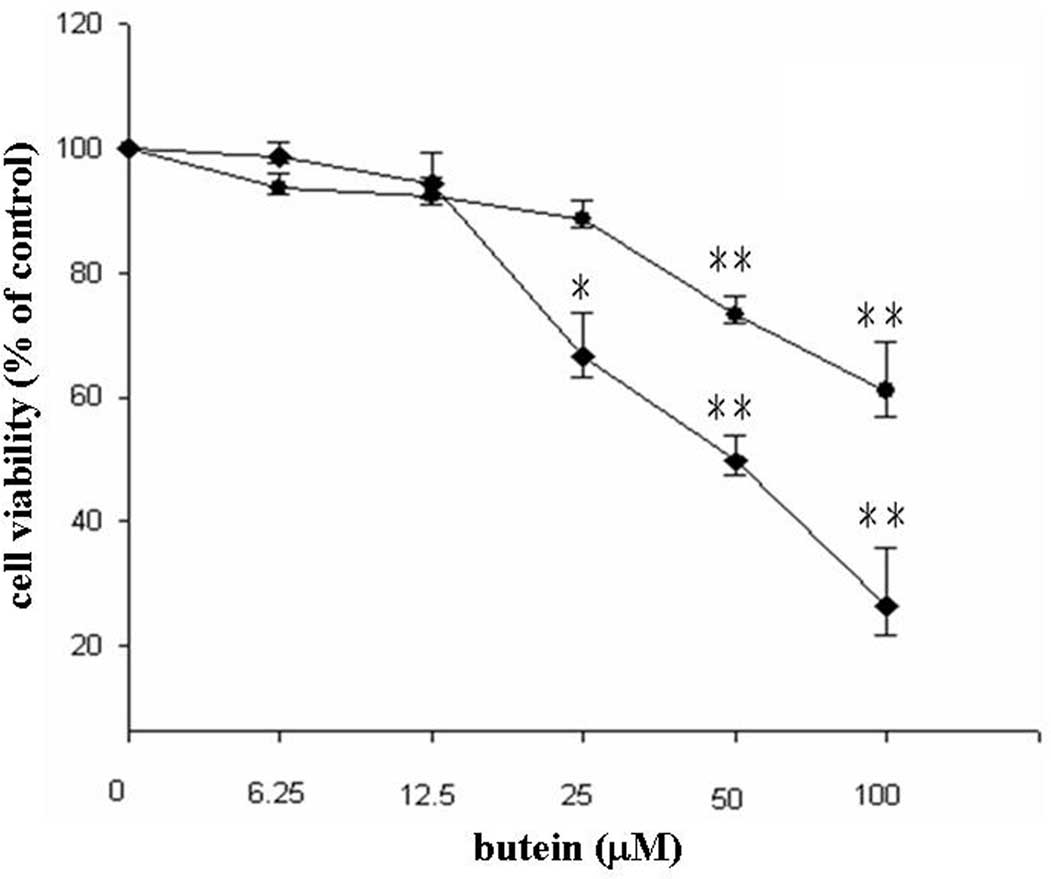Extracts from certain dietary foods or medical plants may function as chemopreventive agents and may inhibit tumorigenesis, including the initiation and promotion of several types of human cancer (1,2). Butein (3,4,2′,4′-tetrahydroxychalcone) is a bioactive polyphenol that is isolated from a number of plants, including Semecarpus anacardium, Dalbergia odorifera and Rhus verniciflua Stokes (R. verniciflua)(3). In Korea, butein is used as a food additive (3). Butein has been shown to demonstrate multiple biological functions, including anti-inflammatory, antioxidative and antimicrobial functions (4,5). Butein abolishes the effects of lipopolysaccharide-induced inflammation through the inhibition of nuclear factor κB (NFκB) activities and c-jun N-terminal kinase (JNK)-dependent pathways (5). Butein has also been shown to exert free radical scavenging activities and suppress H2O2-induced cytotoxicity in RAW264.7 macrophage cell lines (4). Additionally, butein decreases phorbol ester-induced skin cancer formation (6), ameliorates renal concentration capacity in cisplatin-induced renal failure (7), attenuates diabetic complications (8) and facilitates recovery in carbon tetrachloride-induced liver fibrosis (9).