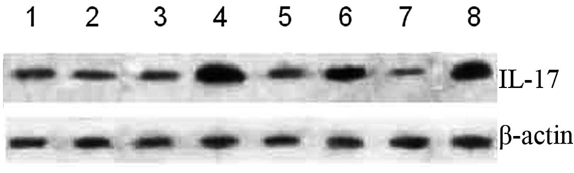 Western blot analysis was used to detect IL-17 protein expression in the PBMCs, SMCs, mesenteric lymph node cells and colon tissues of the normal control mice and disease model mice sacrificed on day 3. First, total protein was extracted from the cells and tissues of each group and UV spectrophotometry was used for protein quantification. Protein samples were then subjected to SDS-PAGE and transferred onto PVDF membranes following electrophoresis. The membranes were blocked at room temperature for 2 h and incubated with 1:800 rabbit anti-mouse anti-IL-17 primary antibody at 4°C overnight. After washing with PBS, the membranes were incubated with 1:1,000 goat anti-rabbit IgG/HRP secondary antibody at room temperature for 2 h, washed 3 times, reacted with chemiluminescence reagents for 5 min, exposed and then developed.