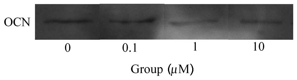 Western blot analysis was performed to detect protein expression following treatment with fulvestrant (Fig. 5). The results showed that the addition of fulvestrant decreased the expression of osteocalcin (Fig. 6). Normalization of the protein expression demonstrated that the group treated with 10 μM fulvestrant yielded 83.8±6.5%, when cultures without fulvestrant were considered to be 100%, however, this did not reach a statistically significant level (P>0.05).