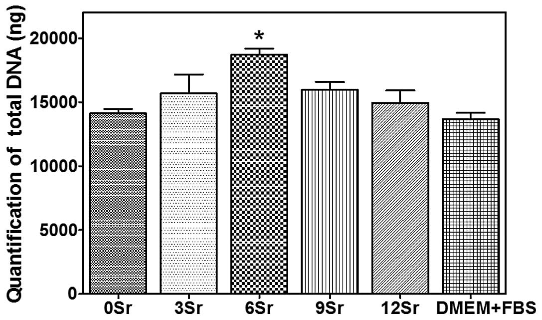 Cytocompatibility behavior with stem cells is an important procedure to assess a novel material prior to application in tissue engineering. In the present study, all the 6Sr groups demonstrated a high relative growth rate after culturing for 3 days. The optical microscopy results revealed that following mixed culturing with MSC cells for 7 days, all groups showed good proliferation. However, the 6Sr group demonstrated the optimum growth performance, both under optical observation and the Live-Dead cell staining. It has been demonstrated that the concentration of boron released from glass incorporating strontium was 2-fold lower than that released from borate glass (16). As the radius of the strontium ion is larger than that of a magnesium or calcium ion, the strontium ion occupies more space in the glass network, and effectively inhibits the movement and release of other ions. Therefore, borate release from the glass particles can be controlled by altering the strontium oxide content in the glass composition. This explains why different compositions of strontium have different growth rates. To investigate the proliferation ability of the strontium-containing borate glass among the five different compositions of strontium, the total DNA concentration following mixed culturing for 7 days was examined in each group. The results indicated that the 6Sr group had the highest DNA quantification, providing evidence of improved proliferation activity in this group. From a molecular biological perspective, a greater amount of proliferation activity and improved duplicate ability may be evident in the strontium-containing groups, particularly in the 6Sr group. However, the detailed underlying mechanism requires further study. Consequently, the cytotoxicity of the rapid release of boron was minimized, and incorporating strontium into borate glass may be regarded as an effective way to promote MSC proliferation.