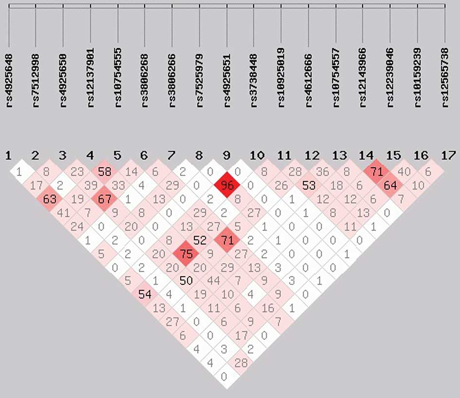 To investigate the haplotype association among the 17 SNPs of the NLRP3 gene, the r2 measure of LD was estimated and demonstrated that only one polymorphism, rs7525979, had a high LD (r2>0.9; Figs. 1 and 2). No individual SNP was demonstrated to be significantly associated with primary gouty arthritis.