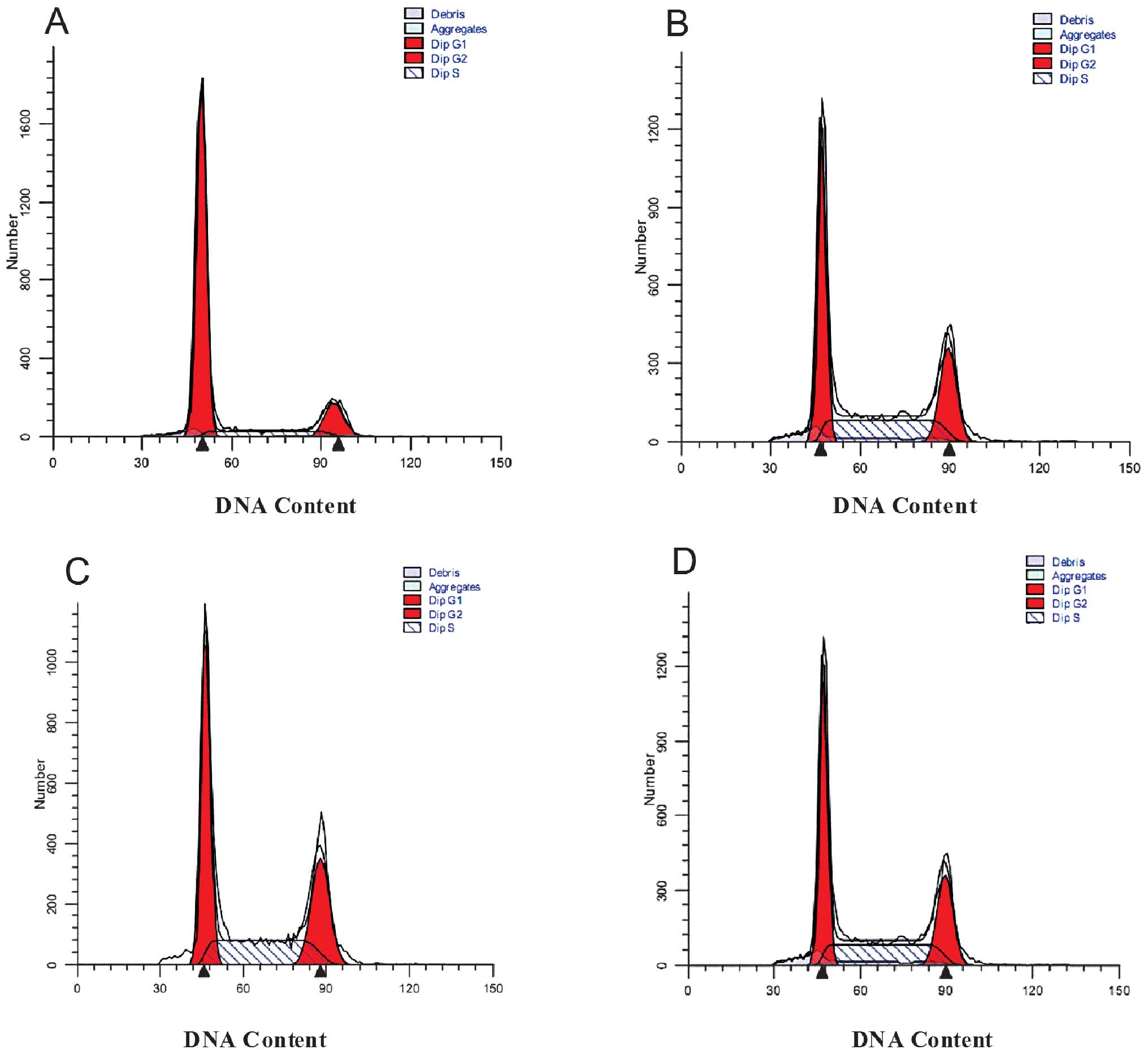 Hepa1-6 cells were seeded into 6-well plates in DMEM containing 10% FBS and treated with various concentrations of recombinant E. coli Trx-JZTX-III (0, 600, 800 and 1,000 μg/m) for 48 h. The cells were harvested, washed in cold PBS and then fixed in 75% alcohol at 4°C for ≥12 h. The fixed cells were resuspended in PBS containing 50 g/l RNase A and 50 mg/l propidium iodide (PI) for 30 min, and analyzed using flow cytometry (Becton Dickinson, USA).
