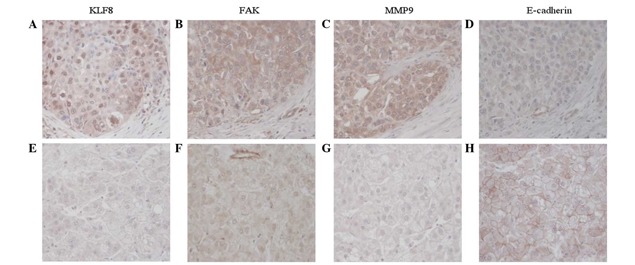 KLF8 has also been reported to play an oncogenic role in HCC. Li et al(15) found that KLF8 promotes HCC cell proliferation and invasion, inhibits apoptosis and induces EMT. However, the molecular mechanisms by which KLF8 enhances HCC cell invasion and metastasis remain poorly understood. We previously hypothesized that the FAK-KLF8-MMP-9/E-cadherin signaling axis plays a vital role in HCC progression. In the present study, KLF8 expression and its clinicopathological significance in HCC was investigated using quantitative real-time reverse transcription polymerase chain reaction (qRT-PCR) and immunohistochemistry. In addition, the correlation between KLF8 and FAK, MMP-9 and E-cadherin expression was determined in HCC.