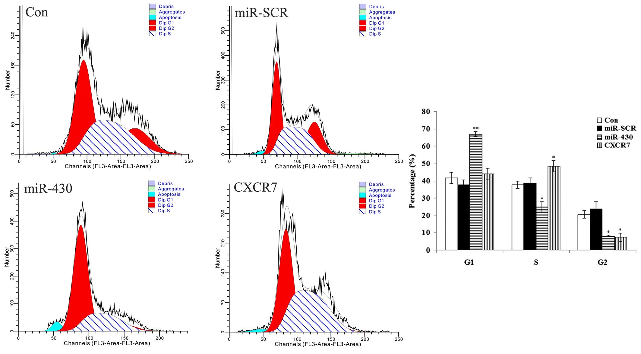 As shown in Fig. 6, the 5637 cells transfected with various plasmids showed differences in the cell cycle. The data demonstrated that the majority of the cells transfected with miR-430 lentiviral vector were in the G1 phase, and the percentage in the S phase was lowest among all groups, indicating that the cell cycle was blocked at the G1 phase. For those cells transfected with the CXCR7 overexpression plasmid, the data showed that the majority of the cells were in the G1 and S phases, and only a few cells were in the G2 phase, indicating that cell division was active. These results suggested that miR-430 suppressed the mitosis of 5637 cells. By contrast, CXCR7 promoted the mitosis of 5637 cells.