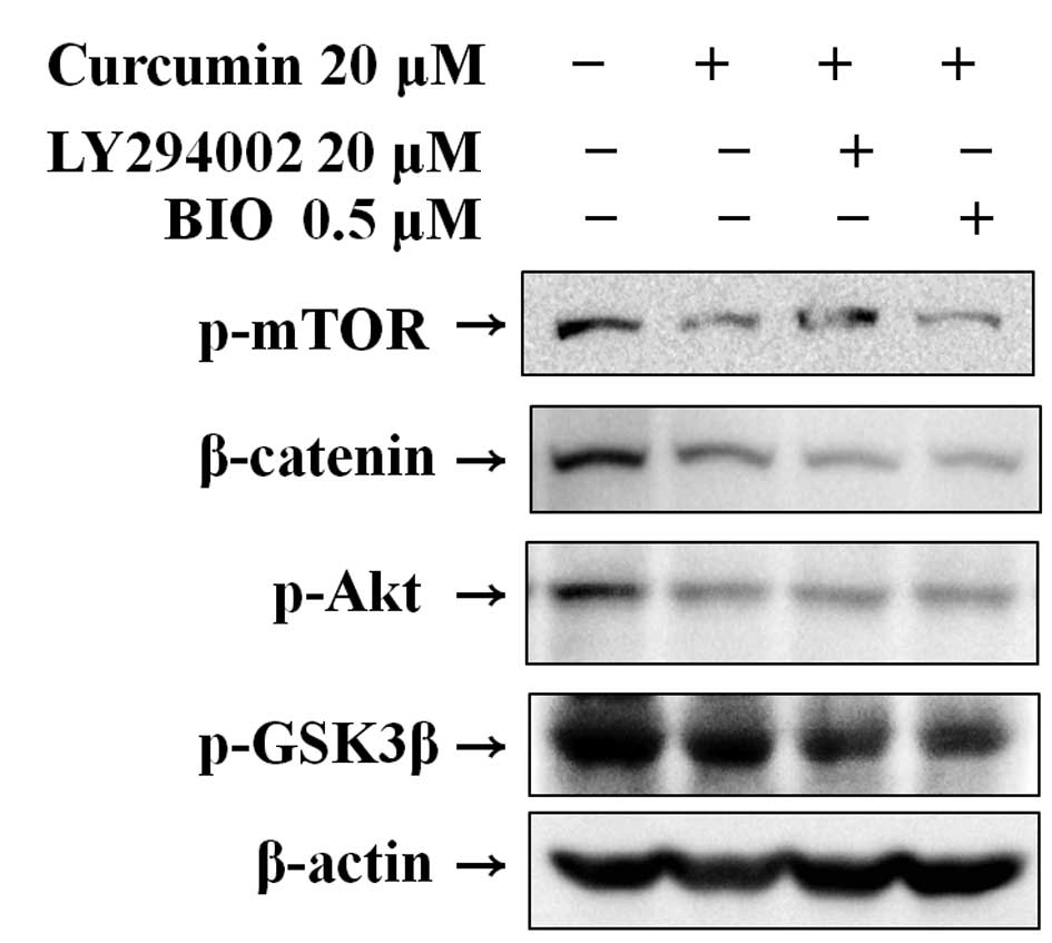 Western blot analysis was used to clarify the mechanism of curcumin-mediated suppression of the Wnt signaling pathway in Hep3B cells by the suppression of specific molecules. The results indicate that curcumin significantly suppressed the expression of p-mTOR, p-Akt, β-catenin and p-GSK3β. Pre-treatment using LY294002 and BIO, specific PI3K and GSK3 inhibitors, respectively, followed by curcumin treatment, effectively reduced β-catenin and phosphorylation of mTOR, Akt and GSK3β (Fig. 4).