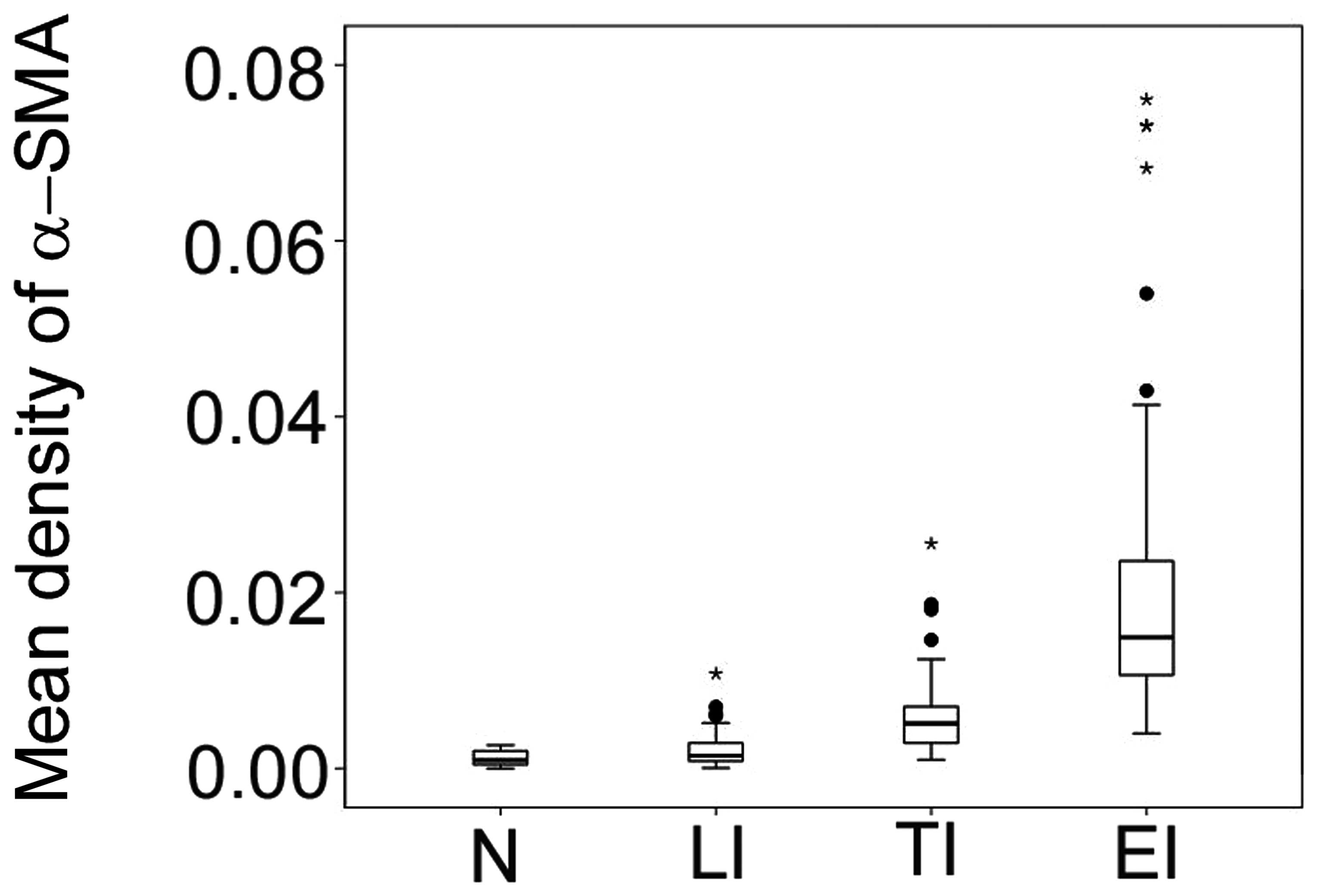 To determine the expression levels of α-SMA in multifocal infarct and villous clumps, mean density of α-SMA was determined in multifocal infarct in early, transitional and late stages. Results demonstrate that the expression levels of α-SMA were lowest in the normomorph, followed by late, transitional and early infarct in all groups (P<0.05; Fig. 2).