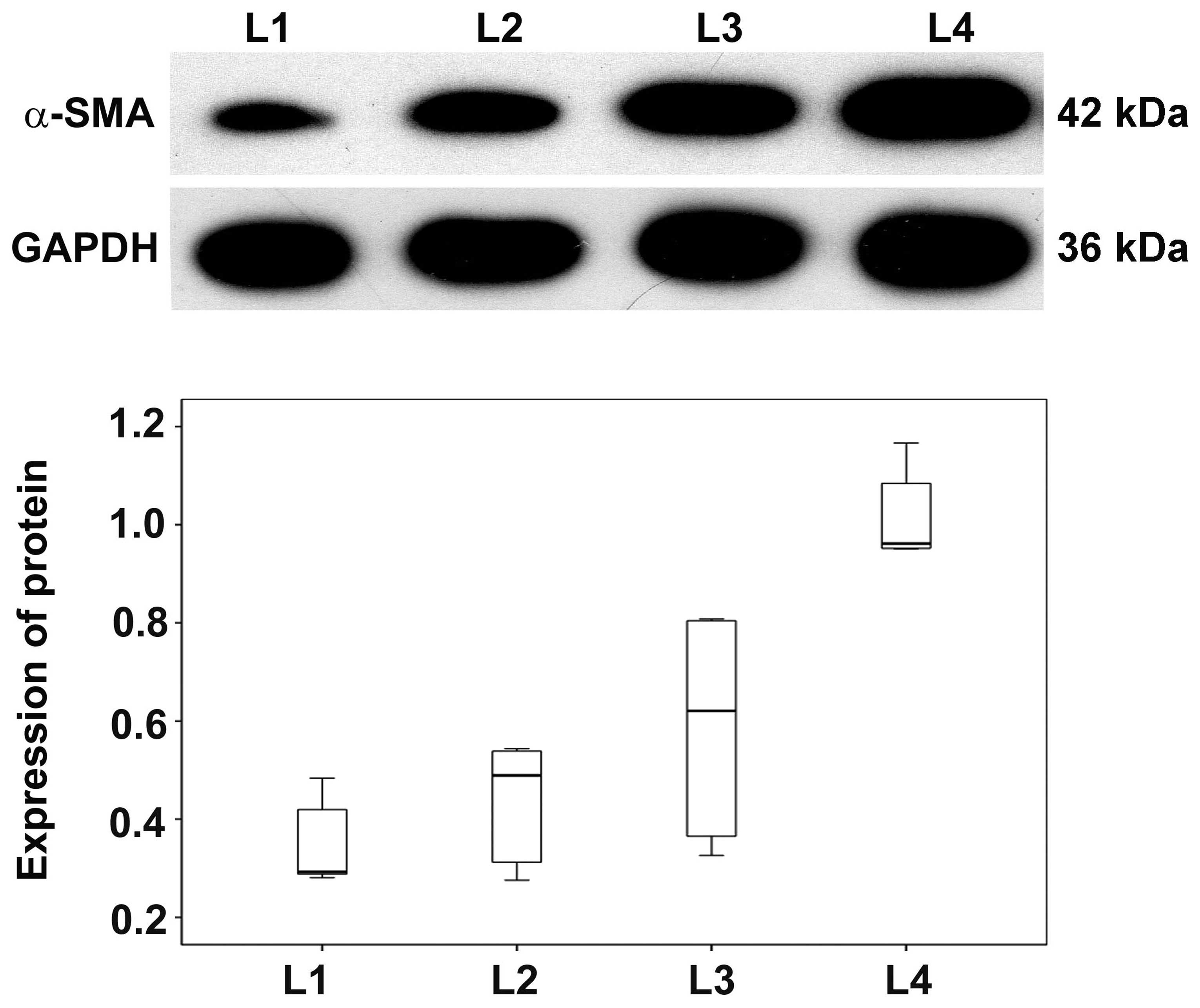 Total RNA was extracted from the samples by TRIzol extraction (Invitrogen Life Technologies, Carlsbad, CA, USA). RNA concentration and purity was determined by absorbance at 260 and 280 nm (OD260/280, >1.8 and <2.1) using a spectrophotometer (NanoDrop 2000; NanoDrop products, Wilmington, DE, USA). RT-PCR (BioRT Two Step RT-PCR, China) was performed by converting 1 μg RNA into cDNA. Reverse transcription was performed according to the manufacturer’s instructions. The reaction system of cDNA systhesis had a total volume of 10 μl, consisting of 5X RT buffer, dNTP mixture (10 mM), oligo-dT, RNase-inhibitor, AMV reverse transcriptase, RNA sample and RNase free H2O. The total PCR volume was 25 μl, containing: 10X PCR buffer, dNTP mixture (10 mM), primer, Taq mix DNA polymerase, cDNA and double distilled H2O. The amplification of nucleic acids was performed using 30 cycles of denaturation at 94°C for 30 sec, annealing at 58°C for 30 sec, extension at 72°C for 1 min and re-extension at 72°C for 5 min. The primers for α-SMA were (forward) 5′-GCGTGGCTATTCCTTCGTTAC-3′ and (reverse) 5′-CATAGTGGTGCCCCCTGATAG-3′, amplified to a 331-bp fragment. The housekeeping gene, GAPDH, served as an internal control. The primers for GAPDH were (forward) 5′-GAAGGTGAAGGTCGGAGT-3′ and (reverse) 5′-GAAGATGGTGATGGGATTTC-3′, amplified to a 226-bp fragment. Primers were designed by Primer software and synthesized by Sangon (Shanghai, China). PCR products were subjected to gel electrophoresis in 1.5% agarose (Invitrogen Life Technologies) followed by staining using bromophenol and were detected by MultiImage Light Cabinet filter positions (Alpha Innotech, San Leandro, CA, USA) and analyzed by Image J software.