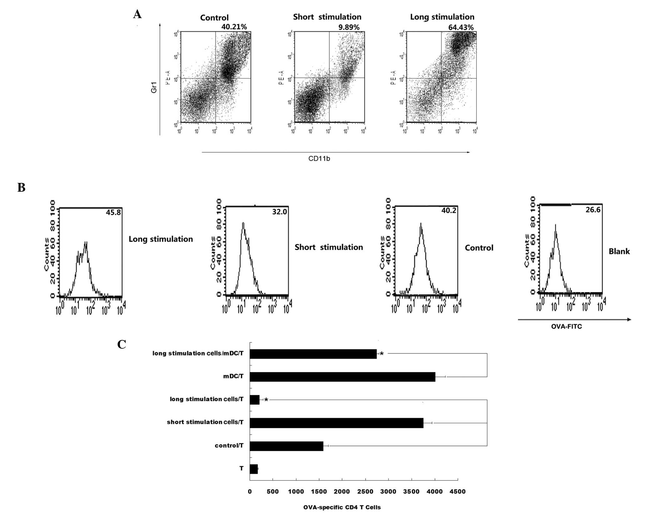 Dendritic cells (DCs) and MDSCs perform different functions in the immune response. DCs are important in initiating the innate and adaptive immune responses (2,3). DCs are also capable of inducing a T-cell immune response by presenting the foreign antigen, upregulating costimulatory molecules and releasing proinflammatory cytokines following microbial or inflammatory activation (4,5). The immune response is regulated by various cell types, including Foxp3+ and IL-10-producing regulatory T cells (6), regulatory DCs (7,8) and MDSCs. MDSCs have been demonstrated to regulate the immune response through arginase, iNOS (9,10), ROS (11) and the induction of Foxp3+ regulatory cells (12,13). The development and expansion of MDSCs is associated with cancer, infection and autoimmunity (1).