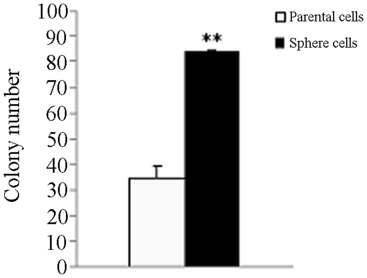 The parental HeLa cells generated 34.67±4.51 colonies and the tumor sphere cells generated 83.67±8.50. The tumor sphere cells exhibited a higher colony forming efficiency compared with the parent adherent monolayer cells (P<0.01; Fig. 2).