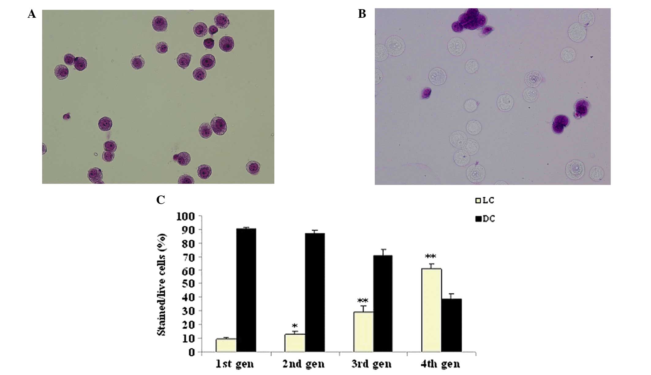 The parental adherent monolayer and tumor sphere HeLa cells contained distinct LC and DC populations (Fig. 4A and B). The number of LCs in tumor sphere HeLa cells (60.94%) was higher than those in the parental adherent monolayer HeLa cells (2.2%; Fig. 4B; P<0.01). LC populations in the tumor sphere increased gradually between 9.48+0.9 and 60.94+3.2% (Fig. 4C) following four passages.
