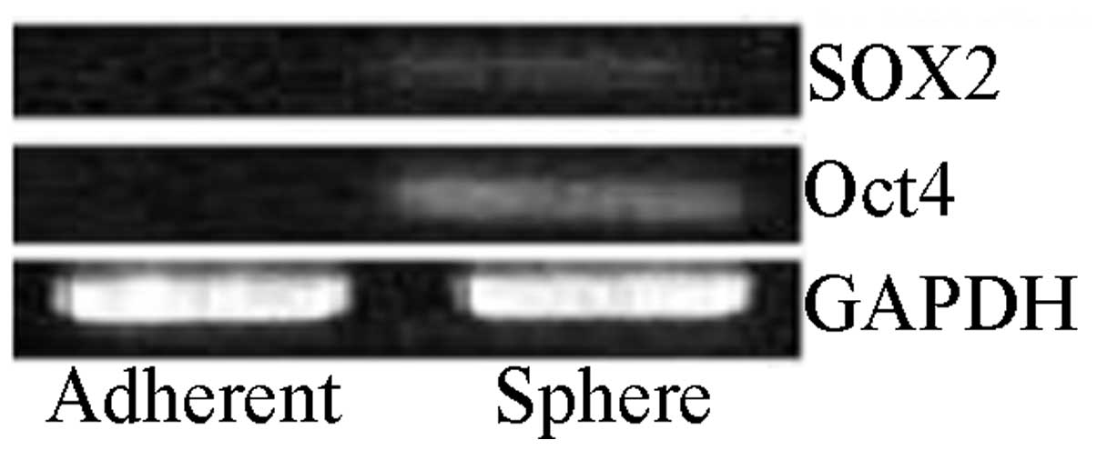 Western blotting demonstrated that there was little expression of Oct4 and SOX2 in the parental adherent monolayer HeLa cells, while their expression was evident in tumor sphere HeLa cells cultured under a nonadhesive culture system (Fig. 7).