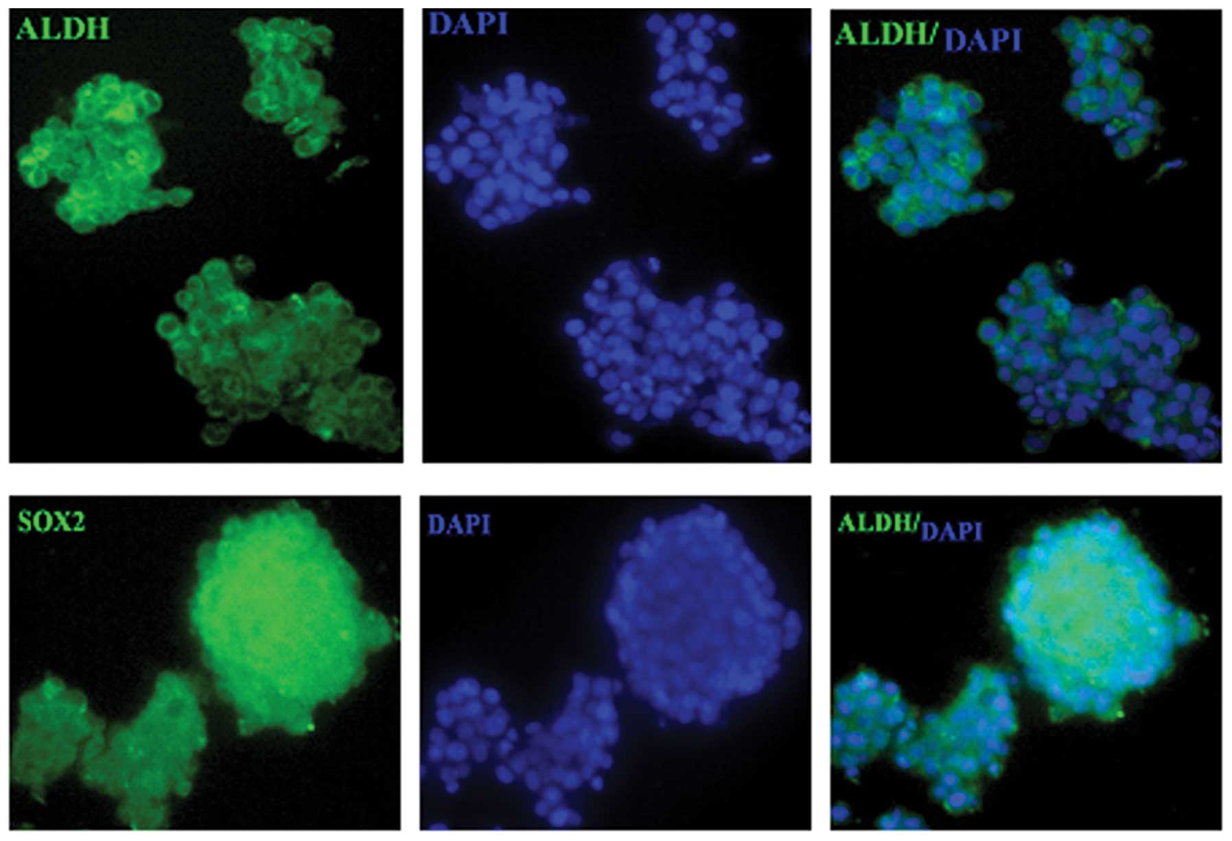 To detect the expression of putative CSC markers in tumor sphere HeLa cells, the parental adherent monolayer and tumor sphere HeLa cells were examined for ALDH1 and SOX2 protein expression. The parental adherent monolayer HeLa cells scarcely expressed ALDH1 and SOX2, while stable ALDH1 and SOX2 expression was detected in tumor sphere HeLa cells (Fig. 8).