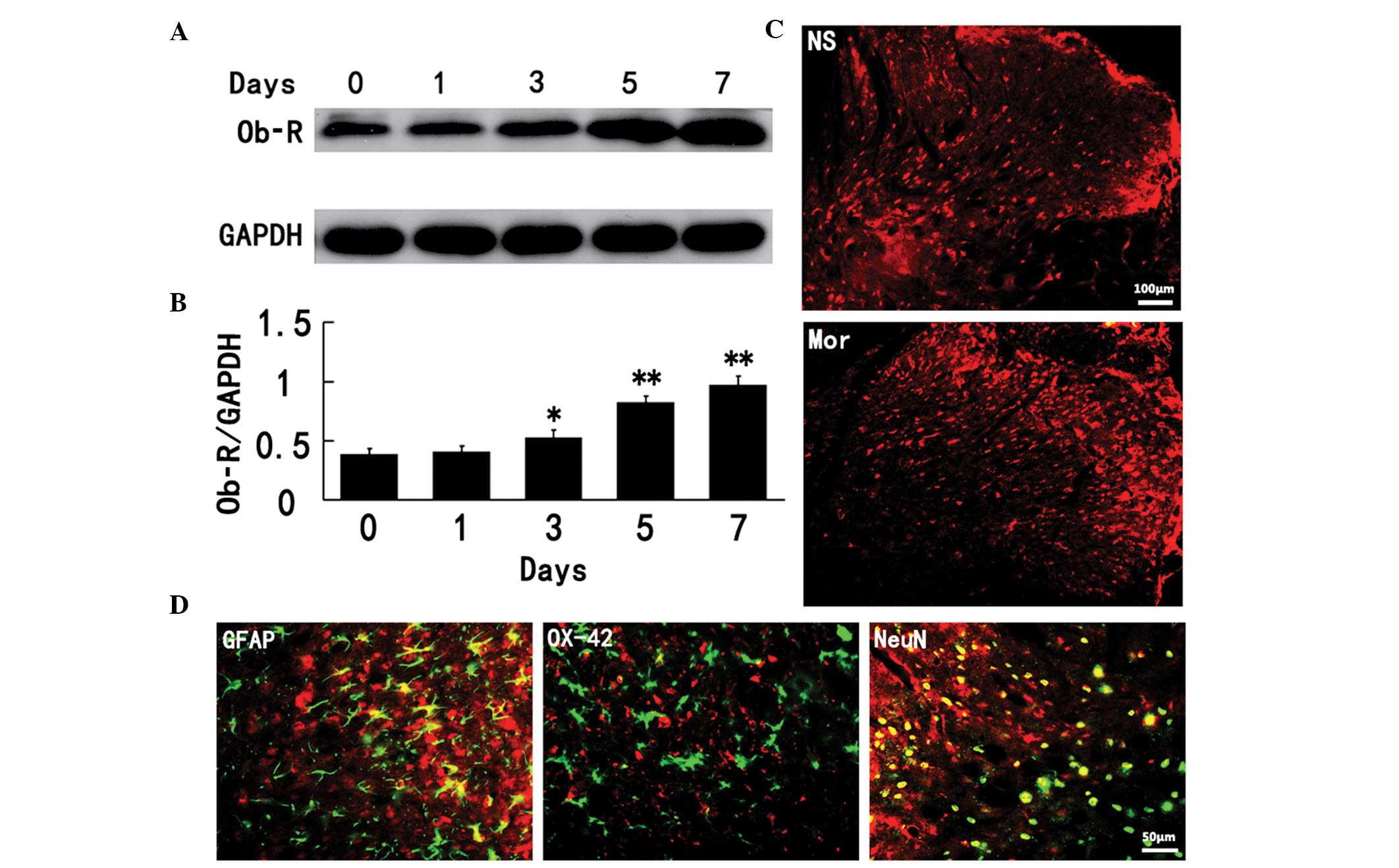 Opioids, such as morphine, have been widely utilized clinically as one of the most potent analgesics for treating acute and chronic pain conditions. However, the clinical utility of opioid analgesics is often limited by the development of analgesic tolerance, that necessitates dose escalation. An increasing number of studies are investigating the neurobiological underpinnings of opioid tolerance, including those on N-methyl-D-aspartate (NMDA) receptors (1,2), proinflammatory cytokines [interleukin-1β (IL-1β), IL-6 and tumor necrosis factor-α (TNF-α)] (3,4) and signal transducer and activator of transcription 3 (STAT3) (5). Recently, we have demonstrated the role of p38 mitogen-activated protein kinase (MAPK) in the development of morphine antinociceptive tolerance (6,7). Based on the data from these studies, it was proposed that the molecules, which can modulate elements such as NMDA receptors, IL-1β, p38 MAPK and STAT3, may contribute to the development of morphine antinociceptive tolerance. It was hypothesized that one candidate molecule for this may be leptin.