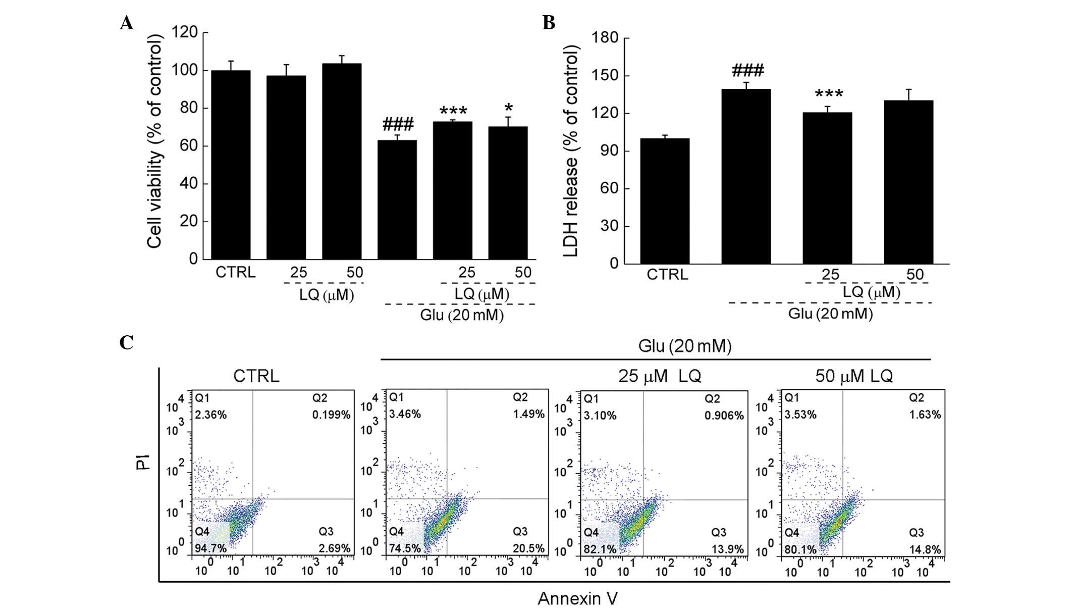 In DPC12 cells exposed to 20 mM glutamate, LDH release was observed to be 39% greater than that in the control cells (P<0.001). However, pretreatment with 25 μM LQ was found to significantly suppress LDH release to levels 20% higher than those in the control cells (139 vs. 120%, P<0.001) (Fig. 2B). Furthermore, flow cytometry revealed that LQ reduced the proportion of apoptotic cells compared with the cells solely exposed to glutamate (Fig. 2C).