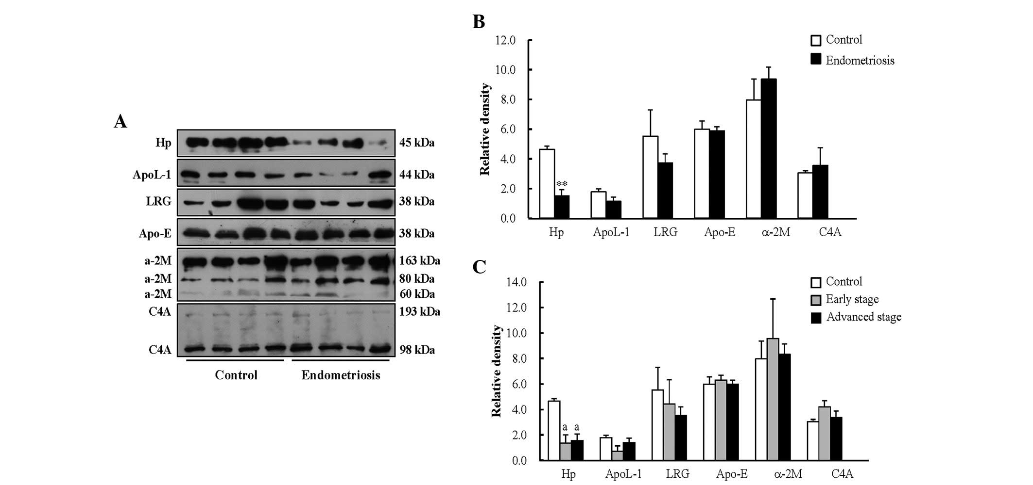Fig. 2C demonstrates the results of early (stages I and II) and advanced (stages III and IV) stage groups when compared with the control, in patients with and without endometriosis. The relative densities of Hp were reduced in early and advanced stages compared with the control (P<0.05). The expression of ApoL-1 generally decreased in the early and advanced stage groups compared with the control group. However, the expression of ApoL-1 in the advanced stage group increased compared with the early stage. The relative density of Apo-E was not observed to be altered in each group. The levels of α-2M and C4A increased in the early and advanced stages compared with the controls.