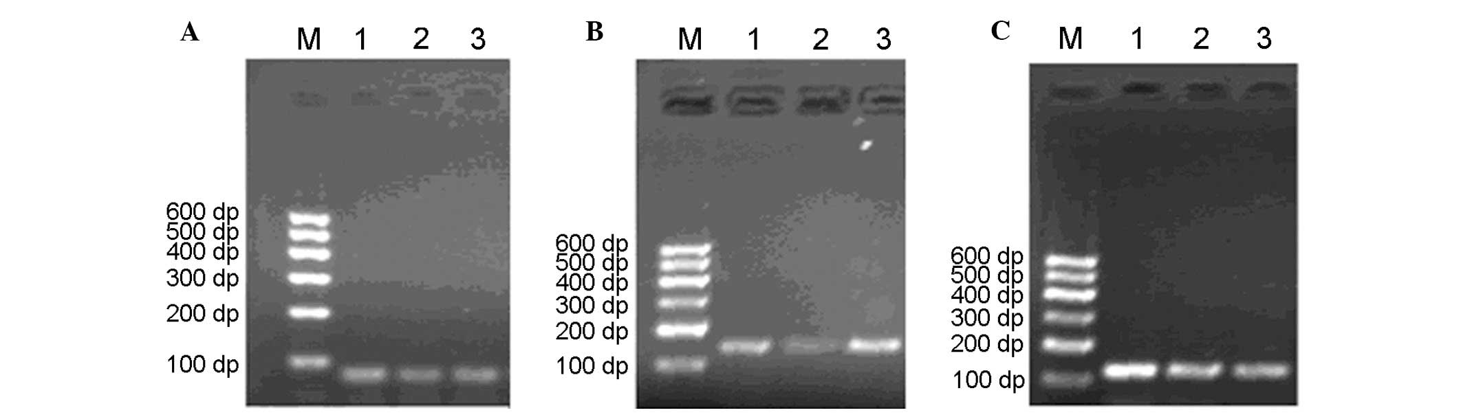 Total RNA was extracted from lymphoblasts, untreated lymphocytes and B95-8 cells using TRIzol reagent (Invitrogen Life Technologies, Carlsbad, CA, USA). A total of 2×106 cells were used for RNA extraction. The purity and integrity of the extracted RNA were examined using electrophoresis. RNA was reverse transcribed into cDNA (Promega Corporation, Madison, WI, USA) according to the manufacturer’s instructions. The primers used in the qPCR are listed in Table I. The B95-8 cells that expressed the EBV genome were used as a positive control to establish the standard curve for qPCR. Each test was repeated twice.