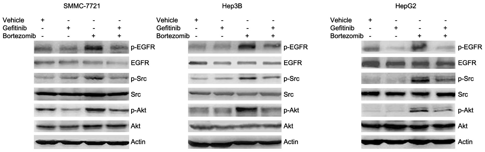 To determine the effect of EGFR phosphorylation on the bortezomib-induced phosphorylation of Src and Akt, the effects of gefitinib, an EGFR inhibitor, on the bortezomib-induced phosphorylation of Src and Akt were examined. Treatment of SMMC-7721 cells with gefitinib eliminated bortezomib-induced phosphorylation of EGFR, Src and Akt (Fig. 2). Similar results were detected in the Hep3B and HepG2 cells (Fig. 2). These results indicated that the activation of EGFR by bortezomib may have contributed to the phosphorylation of Src and Akt.