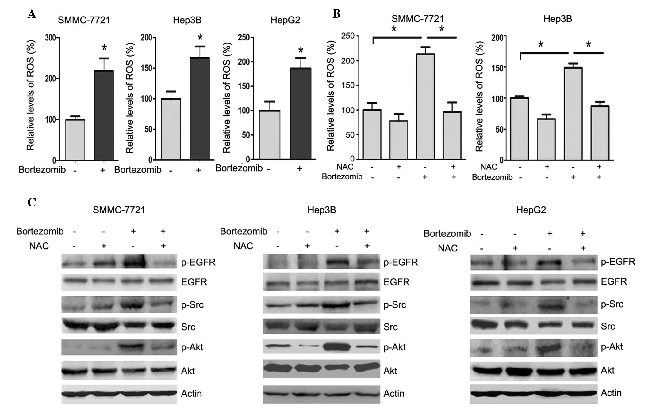 Bortezomib reportedly causes the accumulation of ROS in cancer cells. Treatment of hepatoma cells with bortezomib led to an increase in the levels of ROS (Fig. 4A). NAC, an antioxidant agent, inhibited the induction of ROS by bortezomib (Fig. 4B). To determine whether ROS may trigger phosphorylation of EGFR, Src and Akt, SMMC-7721 cells were treated with or without bortezomib and NAC, followed by western blot analysis of EGFR, Src and Akt phosphorylation. Treatment with NAC abrogated the induction of EGFR, Src and Akt phosphorylation (Fig. 4C), suggesting that ROS mediated the effects of bortezomib on the phosphorylation of EGFR, Src and Akt. Similar results were detected in Hep3B and HepG2 cells (Figure 4C).