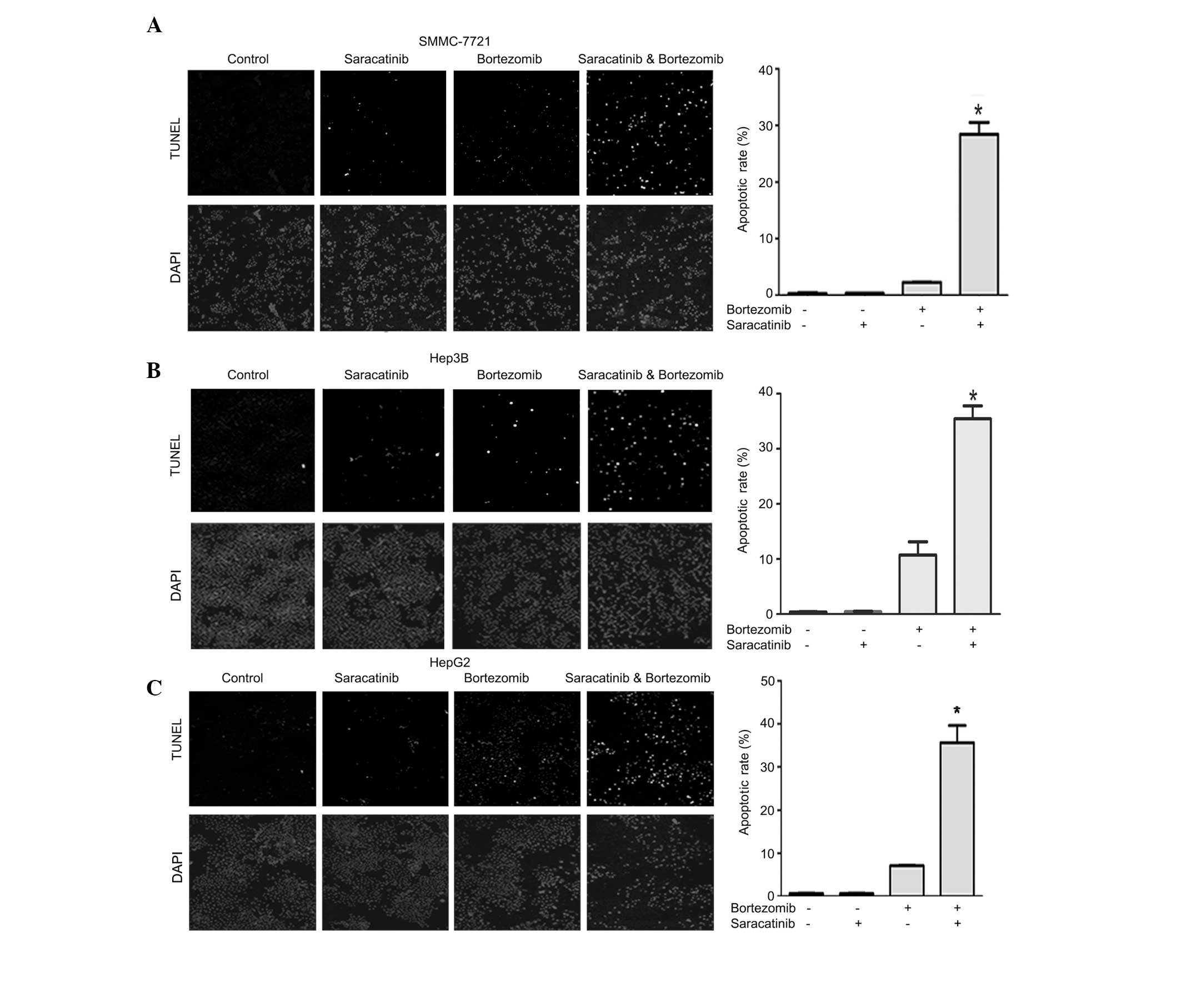 The effect of saracatinib on cell proliferation and apoptosis in bortezomib-treated hepatoma cells was then determined. Cellular proliferation was detected by EdU labeling. No significant difference was identified in the rate of cell proliferation between bortezomib-treated and bortezomib and sarcatinib-treated cells (data not shown). However, treatment of SMMC-7721 cells with saracatinib and bortezomib synergistically induced apoptosis, while induction of apoptosis was poor when either were used alone (Fig. 5A). Similar results were observed in the Hep3B and HepG2 cells (Fig. 5B and C). These results demonstrated that inhibition of Src may have sensitized hepatoma cells to bortezomib.
