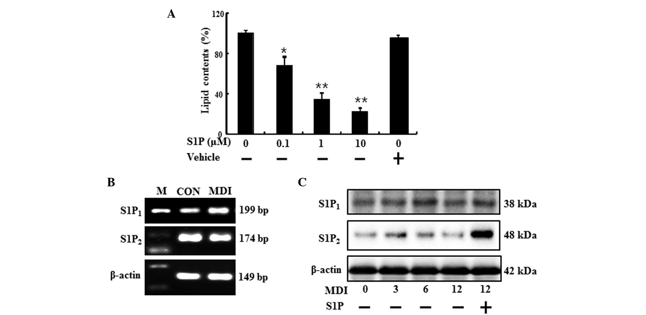 When 3T3-L1 cells were differentiated for over 6 days in the presence of S1P, lipid accumulation was reduced dose-dependently (Fig. 1A). The biological action of S1P is largely ascribed to ligation to specific S1PRs, which evokes distinct biological responses. To assess which receptor is associated with the S1P anti-adipogenic effect, the expression pattern of the known S1P-specific receptors was studied in the 3T3-L1 cells following the addition of MDI (Fig. 1B and C). As shown in Fig. 1B, the preadipocytes and differentiated adipocytes expressed mRNA for S1P1 and S1P2 receptors, as indicated by the presence of 199- and 174-bp bands, respectively. In addition, the treatment of S1P increased the protein expression of S1P2 receptor (Fig. 1C). These results indicated that preadipocytes and differentiated adipocytes express S1P1 and S1P2 receptor, which are known to be associated with cell differentiation, and these receptors may be correlated with the anti-adipogenic function of S1P.