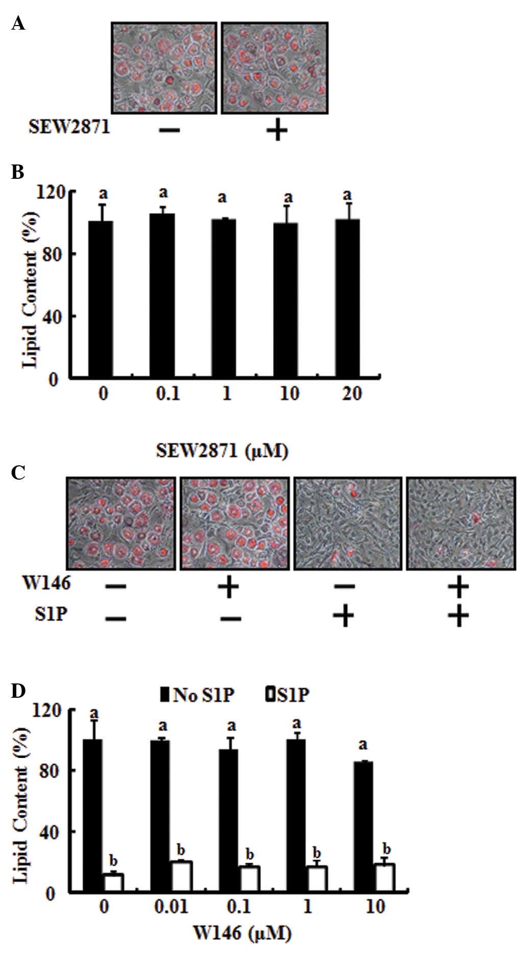 To test the involvement of the S1P1 receptor in anti-adipogenic differentiation, 3T3-L1 preadipocytes were stimulated with SEW2871, a S1P1 selective agonist, to specifically activate the S1P1 receptor. As shown in Fig. 2A and B, SEW2871 had no effect on the adipocyte differentiation inhibitory action of S1P. In addition, the inhibitory action of S1P on lipid accumulation was not restored by blocking the S1P1 receptor using W146, a selective S1P1 antagonist (Fig. 2C and D). These results demonstrate that the anti-adipogenic action of S1P does not occur through the S1P1 receptor.