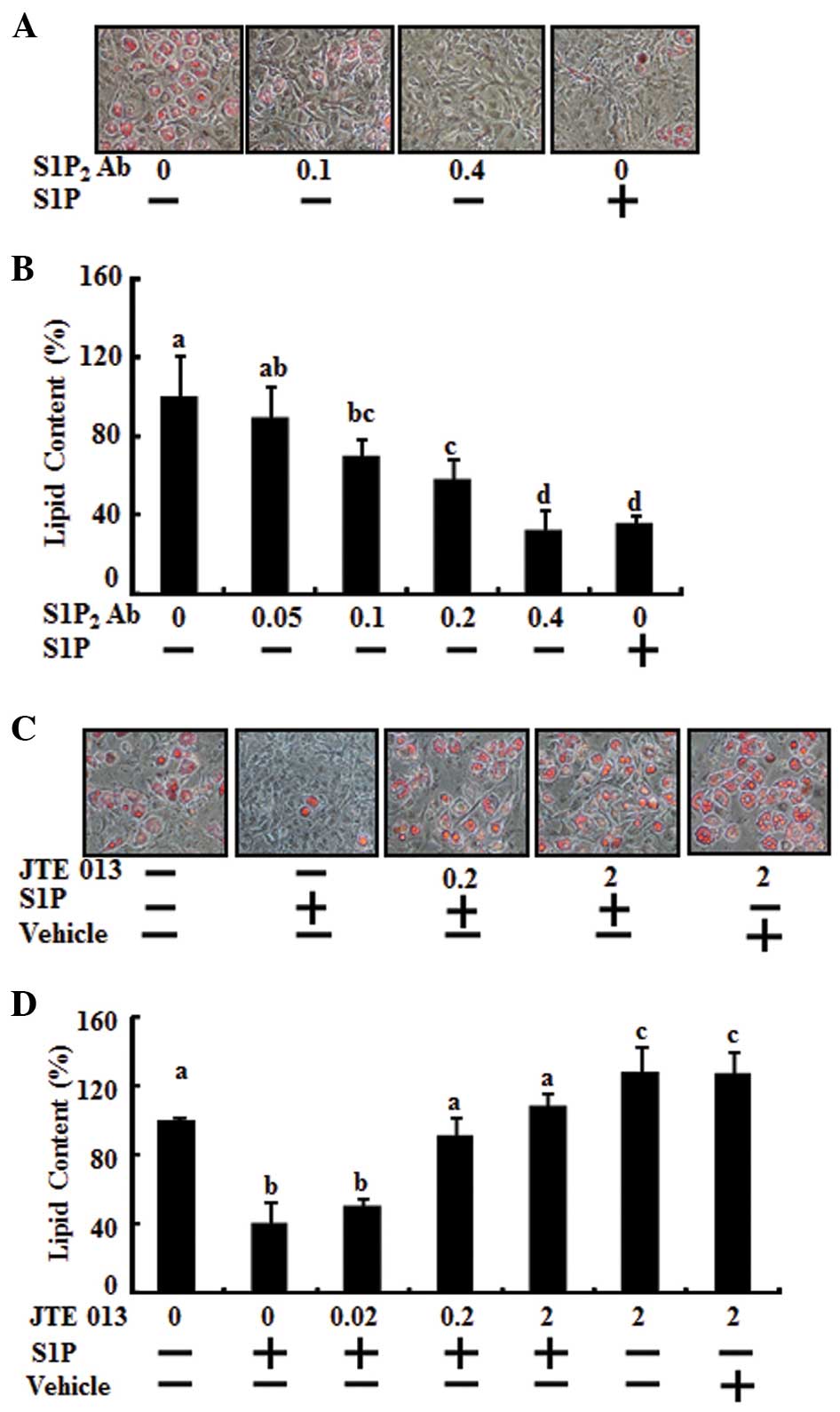 There is a previous relevant study concerning Sphk-1 and adipogenesis, which reveals that Sphk-1 is induced and S1P content increased in adipogenesis, and that its downregulation (using Sphk-1 inhibitors and siRNA) blocks differentiation (21). In addition, S1P content increased in adipogenesis. However, there was no information as to whether direct treatment of S1P has a pro-adipogenic effect. In addition, there is no information on the adipogenic effect of activating Sphk-1 and whether or not the activation of Sphk-1 promotes adipogenesis or increases S1P content. Therefore, we examined the direct effect of S1P and our results revealed that the direct effect of S1P exerted an anti-adipogenic effect via S1P2.