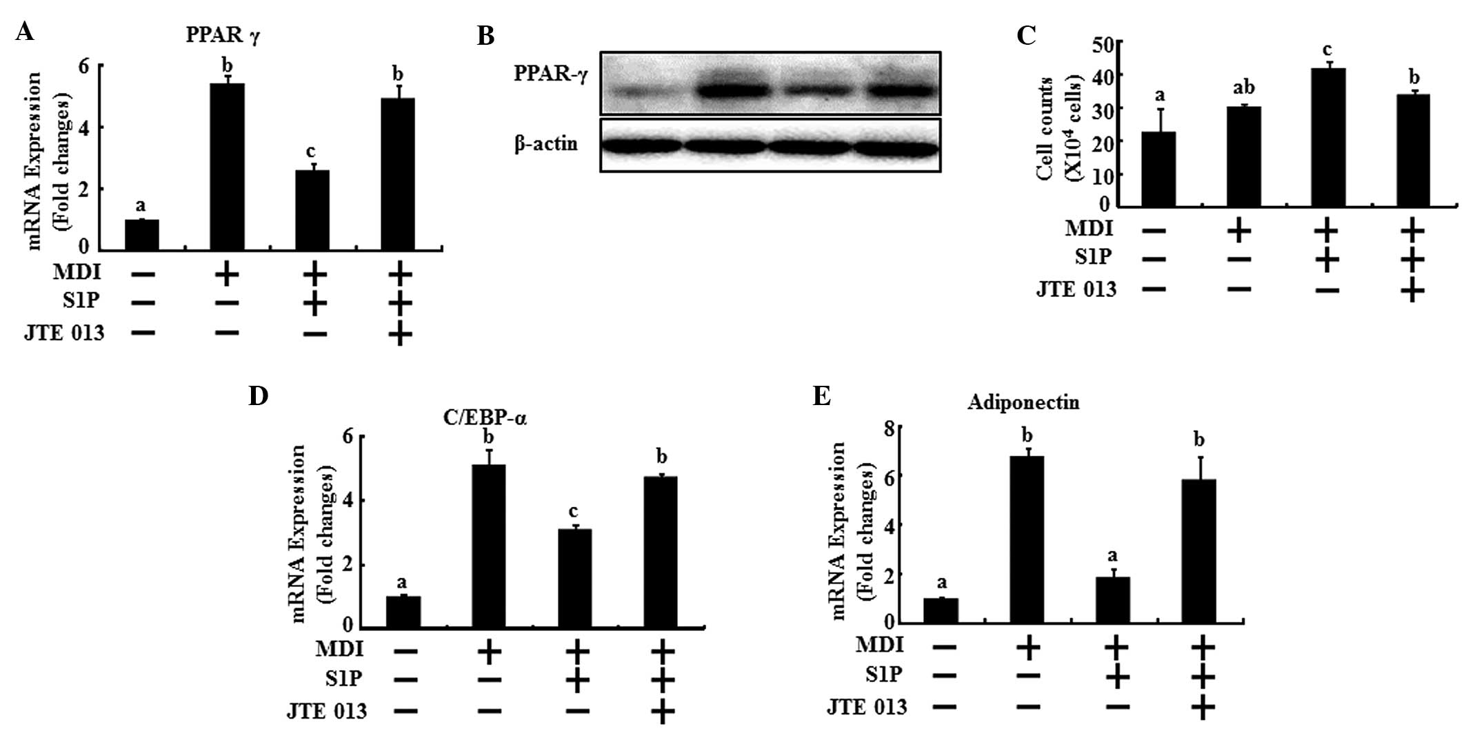 The 3T3-L1 cells were lysed in a lysis buffer (25 mM HEPES; pH 7.4, 100 mM NaCl, 1 mM EDTA, 5 mM MgCl2, 0.1 mM dithiothreitol and protease inhibitor mixture). Proteins were electrophoretically resolved on an 8–15% sodium dodecyl sulfate gel, and immunoblotting was performed as previously described (18). Images were captured using the Fusion FX7 acquisition system (Vilbert Lourmat, Eberhardzell, Germany). The antibodies used for immunoblotting were PPARγ, S1P1, S1P2 (Santa Cruz Biotechnology, Inc.) and β-actin (Sigma-Aldrich).