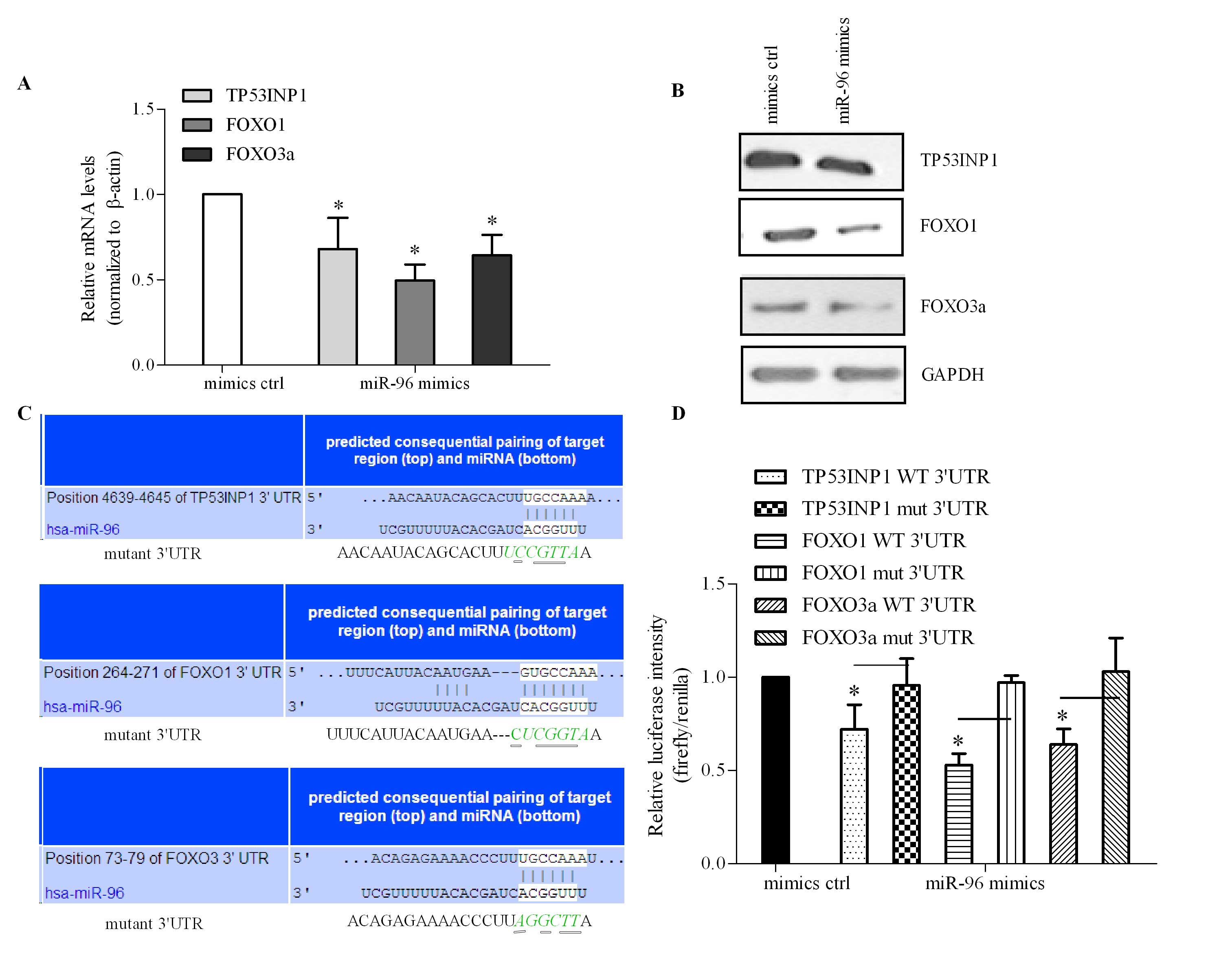 To investigate the direct regulatory roles of miR-96 in these genes, the 3′UTR-containing miR-96 binding sites (Fig. 4C) were cloned downstream of the luciferase reporter gene. The cells were subsequently co-transfected with miR-96 and the cloned luciferase reporter. As indicated in Fig. 4D, it was observed that miR-96 significantly inhibited luciferase intensity of the 3′UTR of TP53INP1, FOXO1 and FOXO3a. To further confirm that these binding sites mediated the inhibitory function of miR-96, mutations within the binding sites were generated. It was demonstrated that miR-96 did not influence the fluorescence intensity of TP53INP1, FOXO1 and FOXO3a containing the mutant 3′UTR (Fig. 4D). These results suggested that TP53INP1, FOXO1 and FOXO3a were direct target genes of miR-96 and were negatively regulated by miR-96.