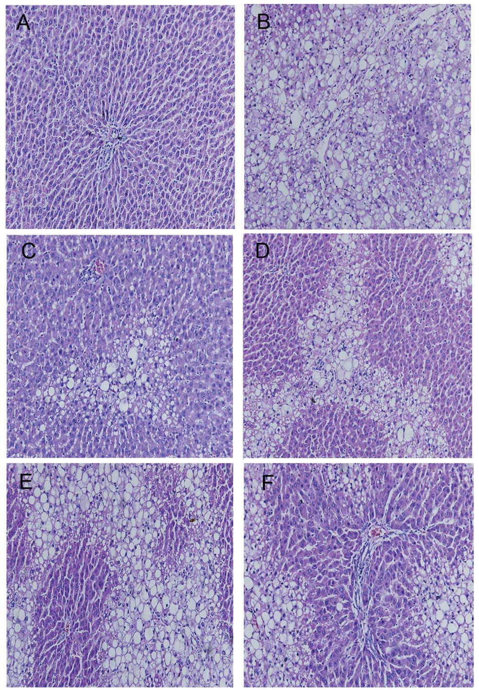 HE staining indicated that CCl4 administration resulted in extensive morphological changes to the animals’ livers, including marked fatty acid degeneration, necrosis, hepatocyte ballooning and infiltration of inflammatory cells into the interstitial space of the livers. Liver tissue from the control group tissue showed normal lobular architecture with central veins and radiating hepatic cords (Fig. 2A). The histological pattern of tissue of subjects treated with APE (1.3, 2.6 and 5.2 g/kg) showed a lesser degree of liver injury and inflammation (Fig. 2C–E). A similar trend of reduced hepatic injury and inflammation was also observed in the tissue of colchicine-treated rats (Fig. 2F).