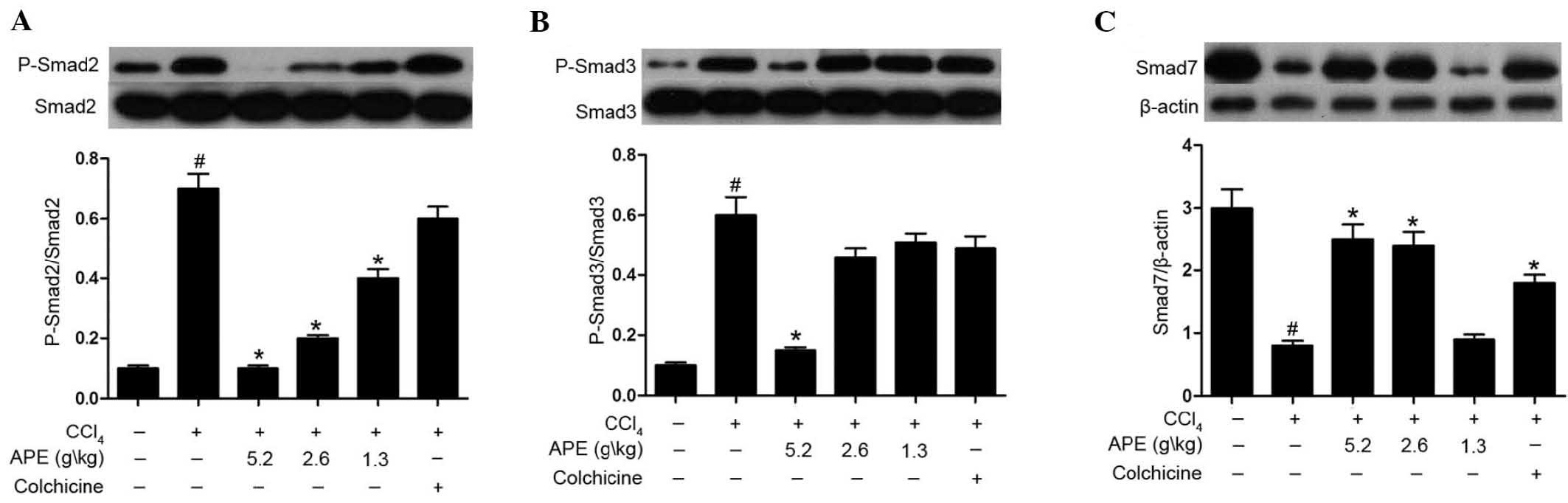 TGF-β1 controls a diverse set of cellular processes and its canonical signaling is mediated via TGF-β-induced phosphorylation of receptor-activated Smad2 and Smad3 (46). Smad7 is the negative feedback regulator for TGF-β signaling, acting to antagonize the activity of the receptor-regulated Smads, which leads to the termination of TGF-β signaling (47). The present study showed that APE significantly inhibited the phosphorylation of Smad2 and Smad3 and reversed the inhibitory effect of CCl4 treatment on Smad7 expression. Therefore, it was hypothesized that the anti-fibrotic effects of APE occur via the TGF-β1/Smad pathway.